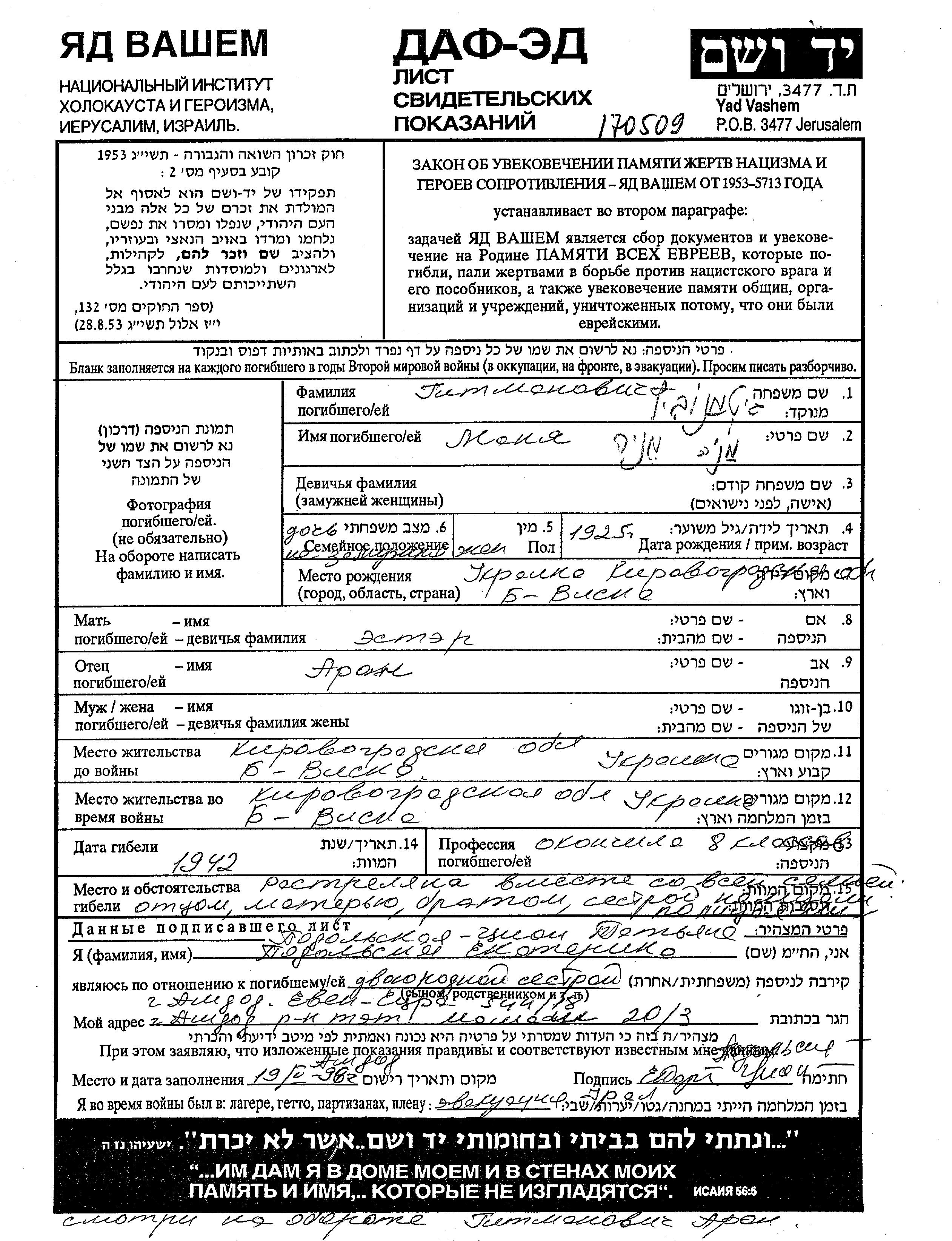 | Gitmanovich | Menya Manya | 1925 | Velikaya Viska, Ukraine (USSR) | Page of Testimony |