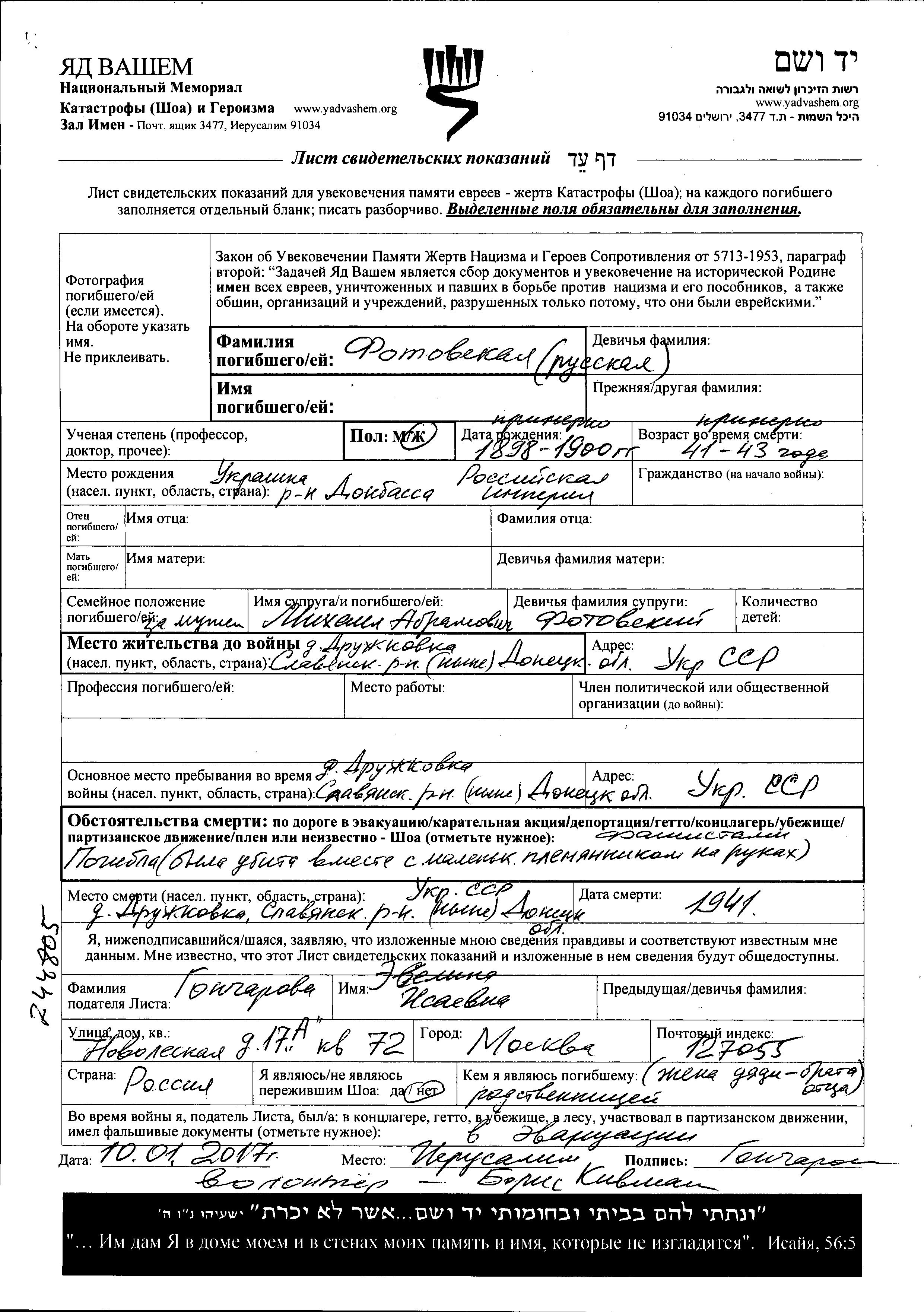 First name unknown Fatovskaya was born in Donbass Region, USSR. She was married to Mikhail. Prior to WWII she lived in Druzhkovka, Ukraine (USSR). During the war she was in Druzhkovka, Ukraine (USSR). She was murdered in the Shoah. Place of death: Druzhkovka, Ukraine (USSR), 1941.