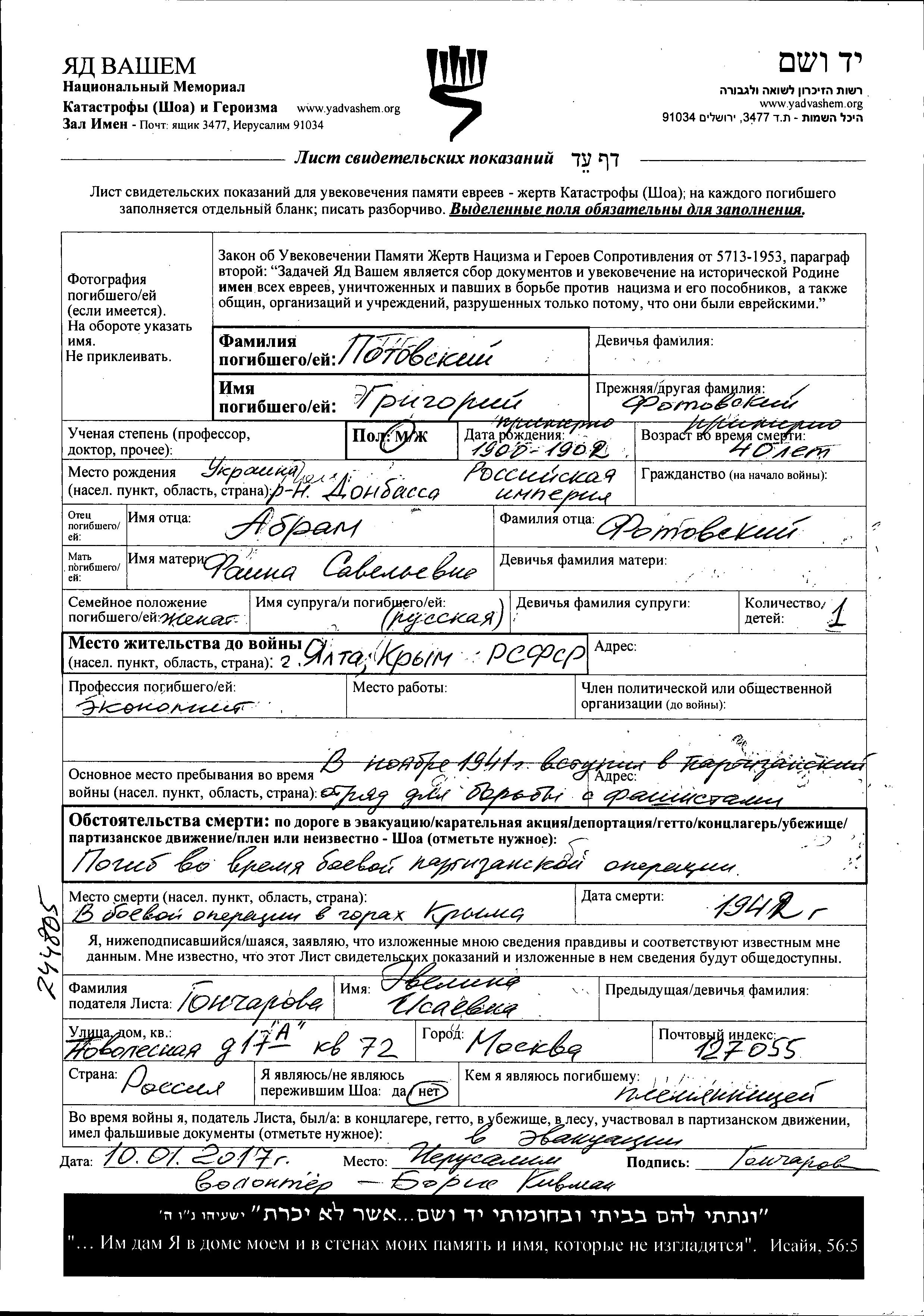 Potovskiy Grigoriy Yalta, Russia (USSR) Page of Testimony