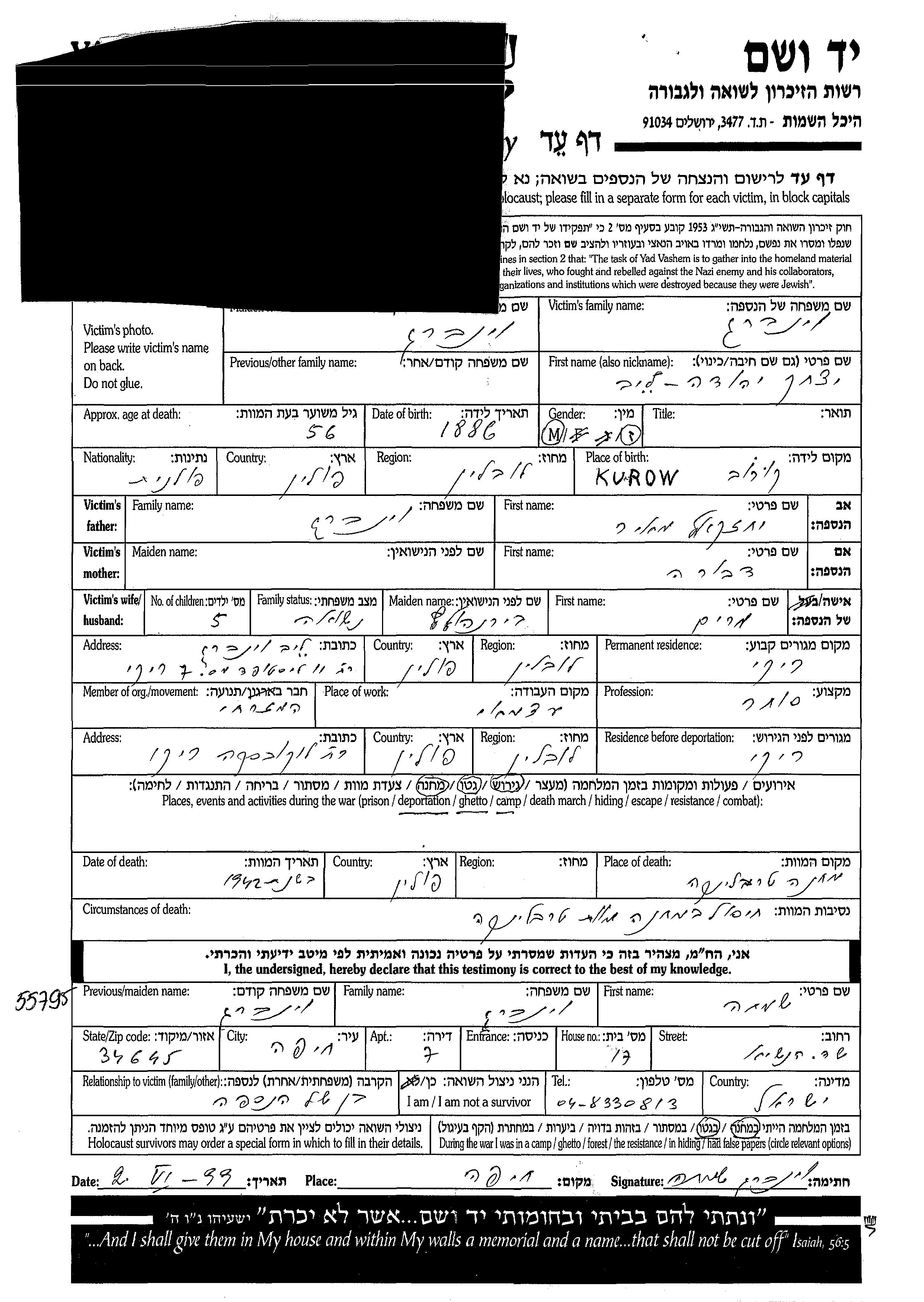 Yitzkhak Leib Arie Wajnberg was born, 1886. He was a merchant. Prior to WWII he lived in Ryki, Poland. Yitzkhak Leib Arie was murdered in the Shoah. Place of death: Treblinka, Poland, 1942.