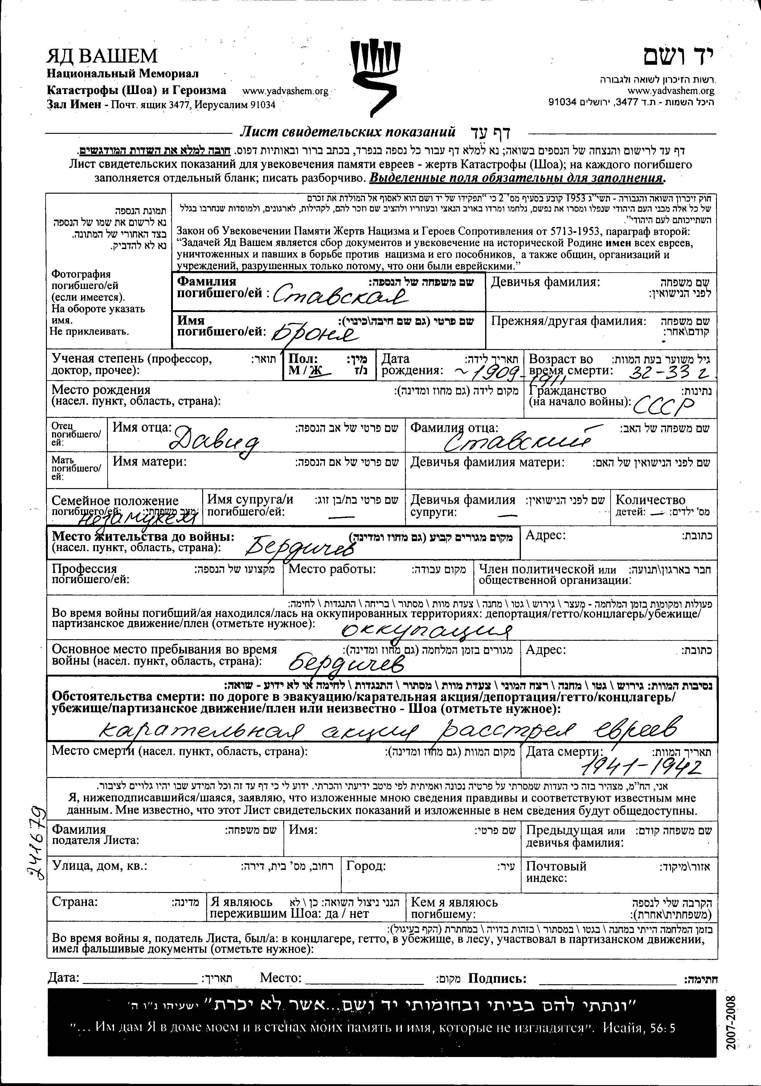 Stavskaya Bronya 1911 Berdichev, Ukraine (USSR) Page of Testimony