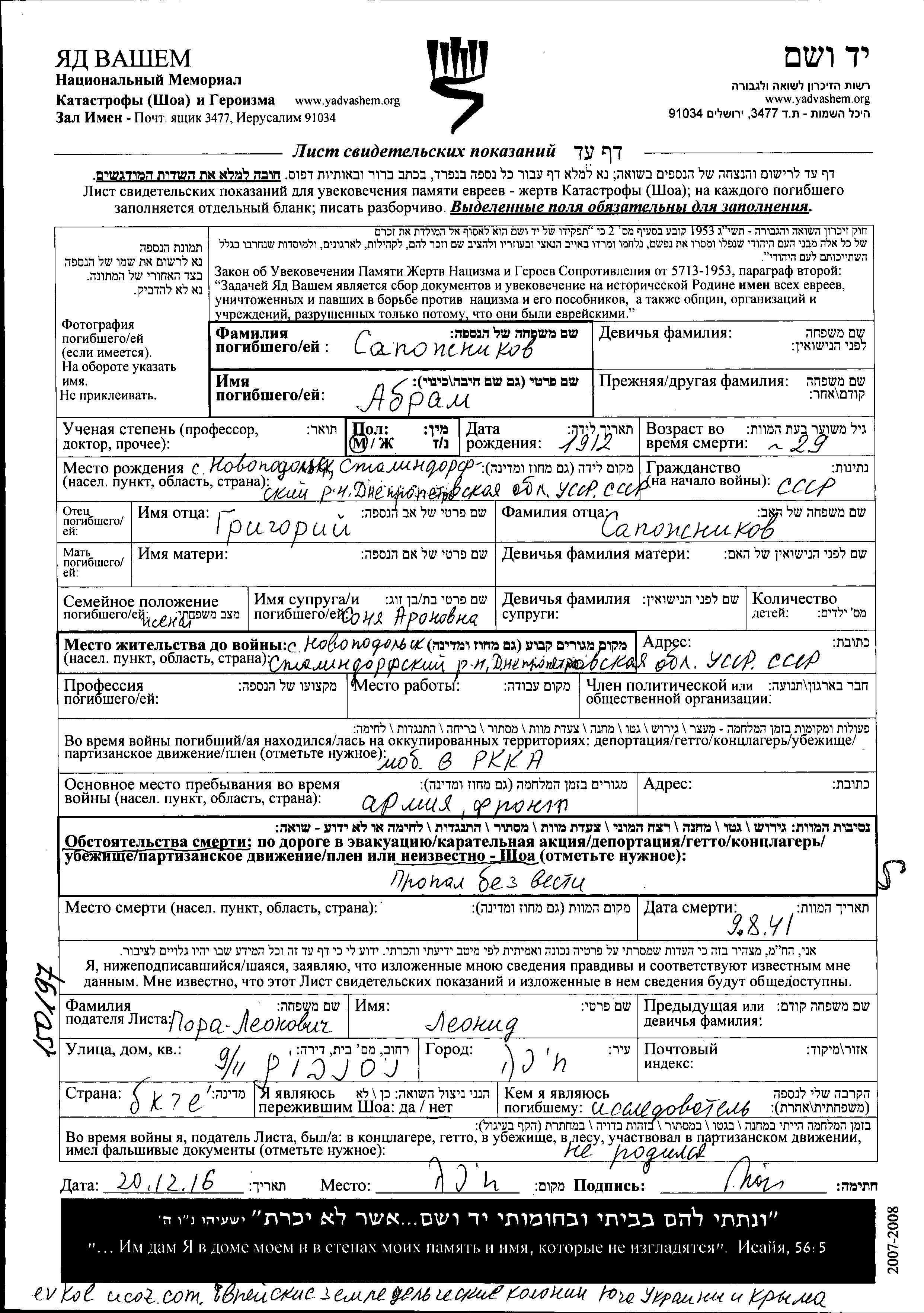 Abram Sapozhnikov was born in Novopodolsk, Ukraine (USSR), 1912 to Grigoriy. He was married to Sonya. Prior to WWII he lived in Novopodolsk, Ukraine (USSR). During the war he was in the Soviet armed forces. Abram was murdered in the Shoah. Place of death: unknown, 09/08/1941.
