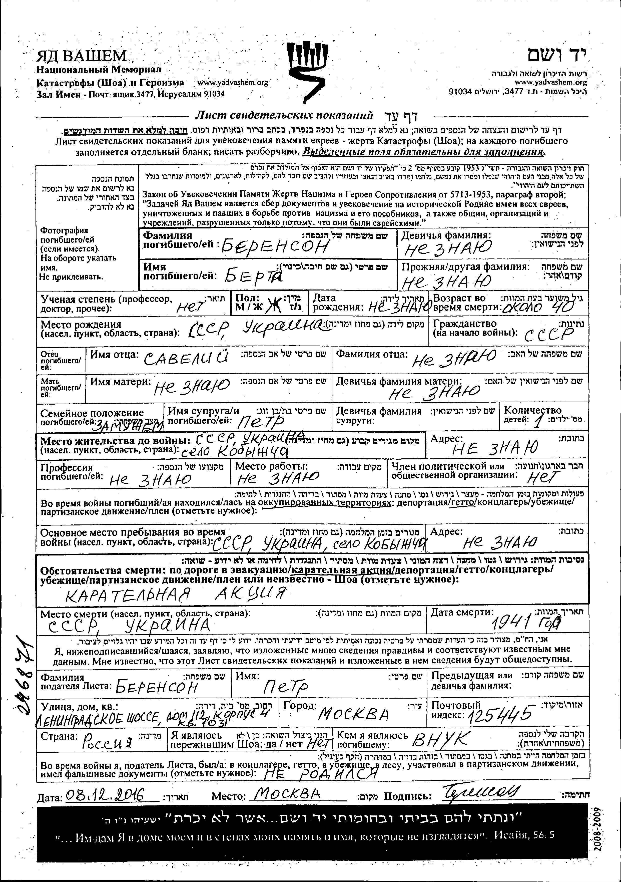 Berta Berenson was born in Ukraine (USSR) to Saveliy. She was married to Pyotr. Prior to WWII she lived in Kobyzhcha, Ukraine (USSR). During the war she was in Kobyzhcha, Ukraine (USSR). Berta was murdered in the Shoah. Place of death: Ukraine (USSR), 1941.