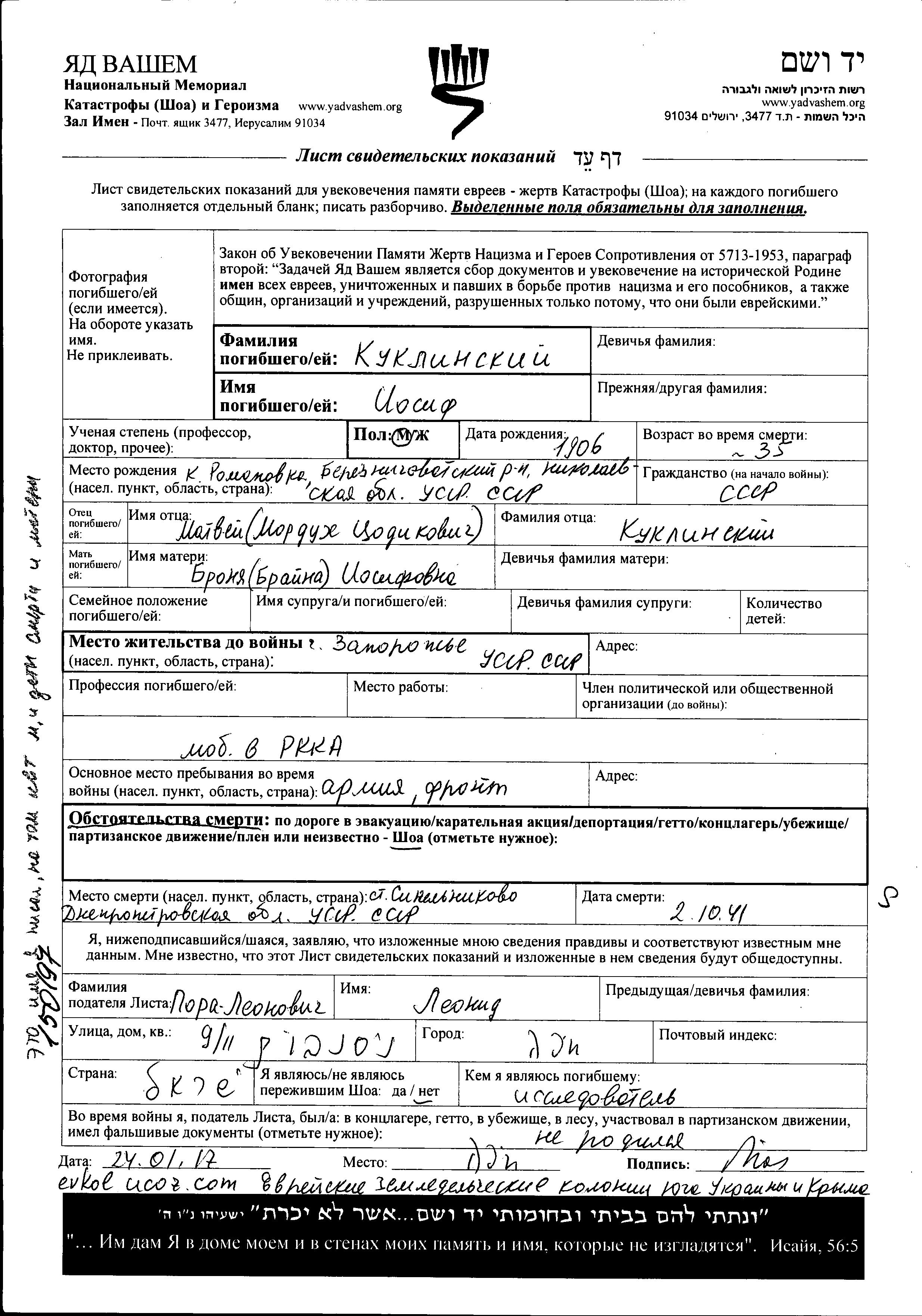 Iosif Kuklinski was born in Romanovka, Ukraine (USSR), 1906 to Matvey Mordukh and Bronya Brayna. Prior to WWII he lived in Zaporozhye, Ukraine (USSR). During the war he was in the Soviet armed forces. Iosif was killed in military service in WWII. Place of death: Sinelnikovo, Ukraine (USSR), 02/10/1941.