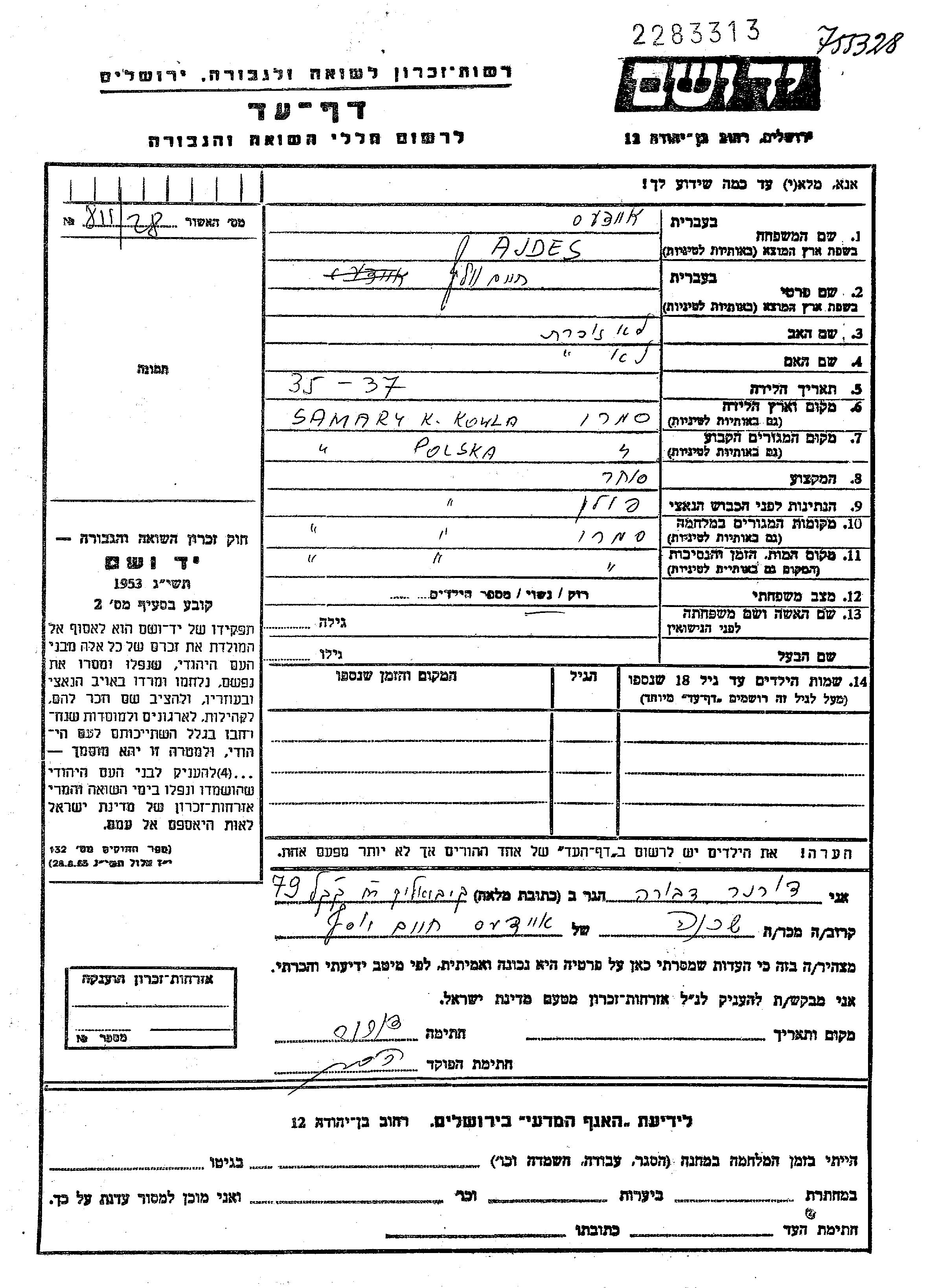 Ajdes Chaim Wolf Samary, Poland Page of Testimony