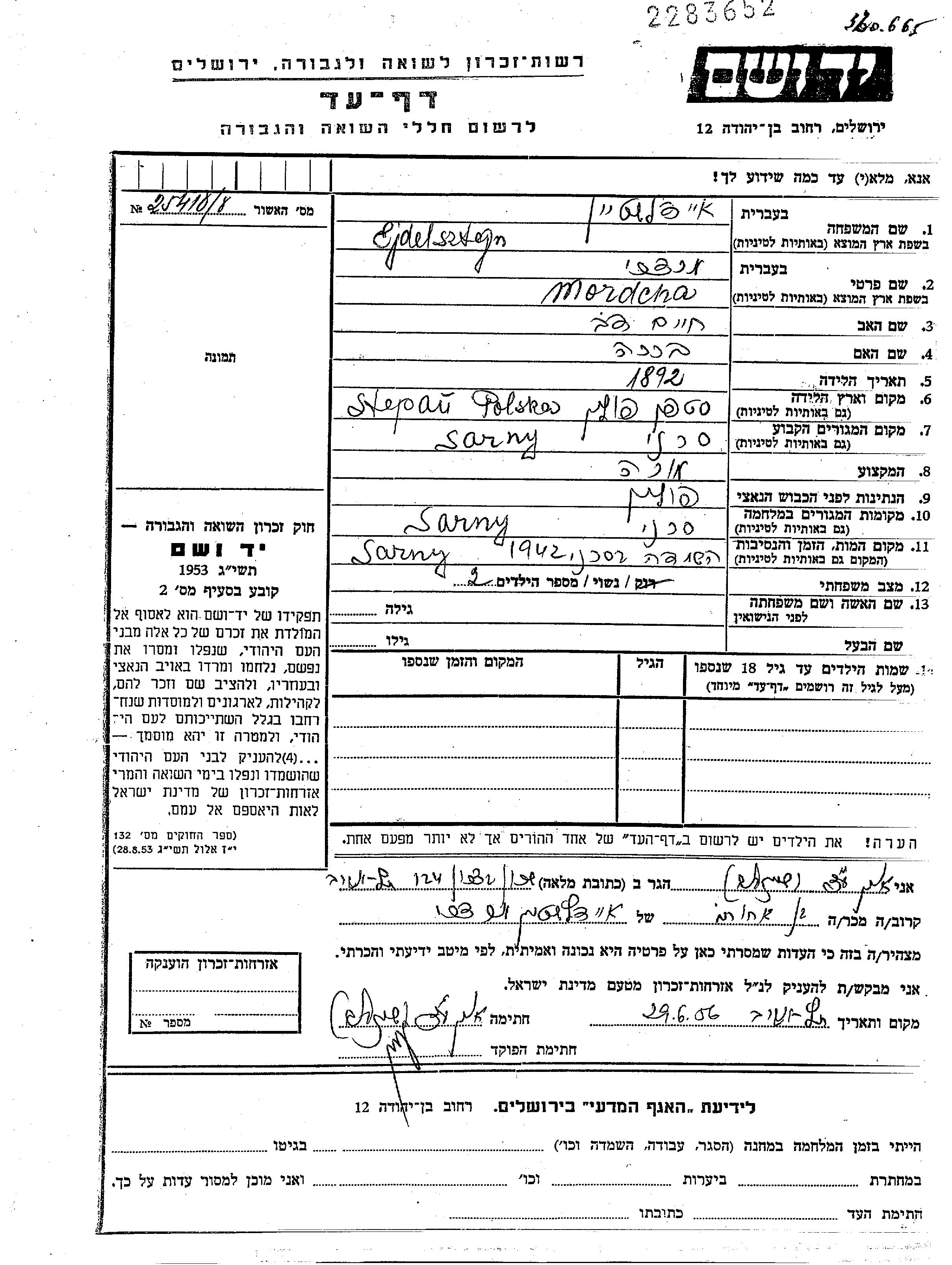 Mordcha was murdered in the Shoah. Place of death: Sarny, Poland, 1942.