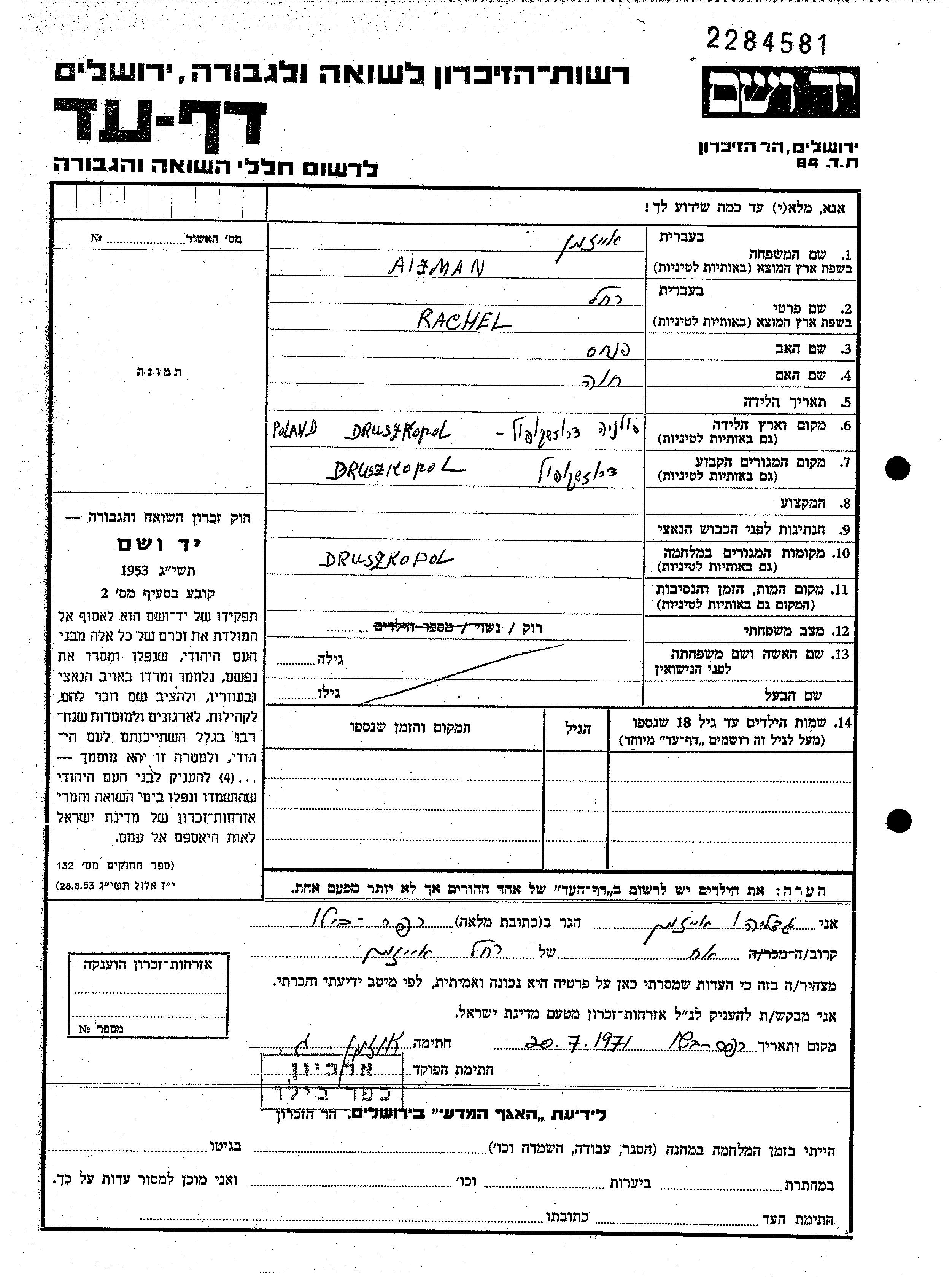 Aizman Rachel Druszkopol, Poland Page of Testimony