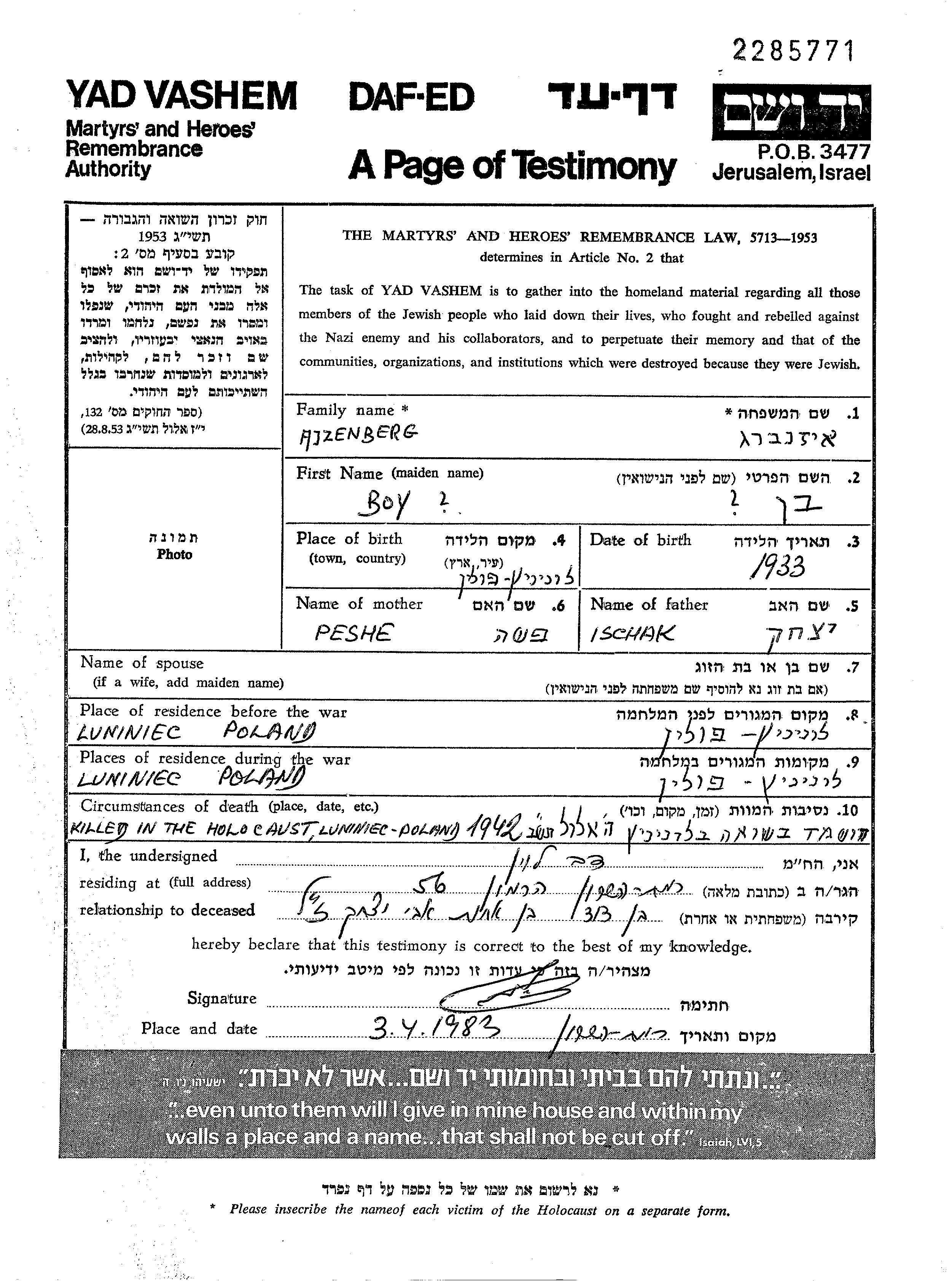 First name unknown Ajzenberg was born in Luniniec, Poland, 1933 to Ischak and Peshe. He was child. Prior to WWII he lived in Luniniec, Poland. During the war he was in Luniniec, Poland. He was murdered in the Shoah. Place of death: Luniniec, Poland, 18/08/1942.
