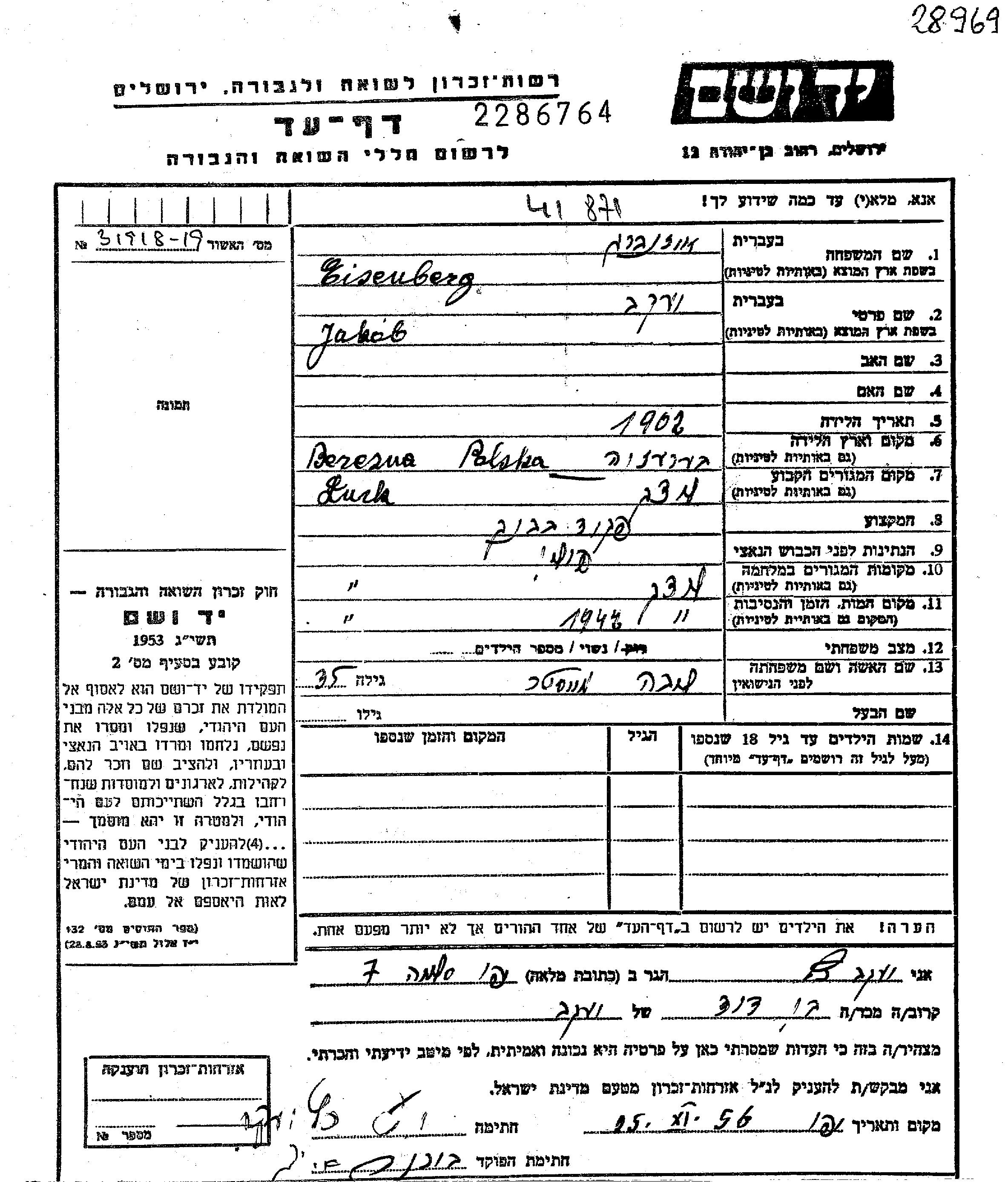 Eisenberg Yakob 1902 Luck, Poland Page of Testimony