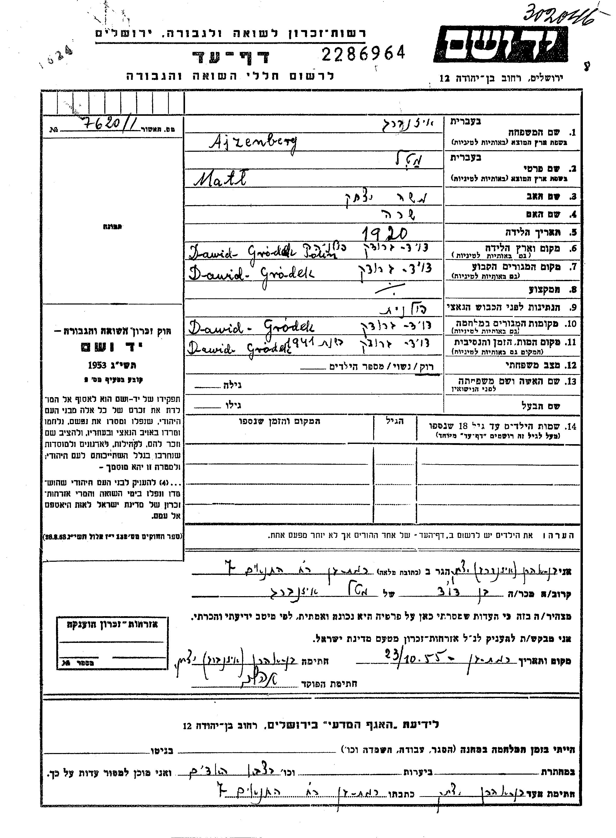 Matl Ajzenberg was born in Dawidgrodek, Poland, 1920 to Moshe Ytzkhak and Sara. He was single. Prior to WWII he lived in Dawidgrodek, Poland. During the war he was in Dawidgrodek, Poland. Matl was murdered in the Shoah. Place of death: Dawidgrodek, Poland, 1941.