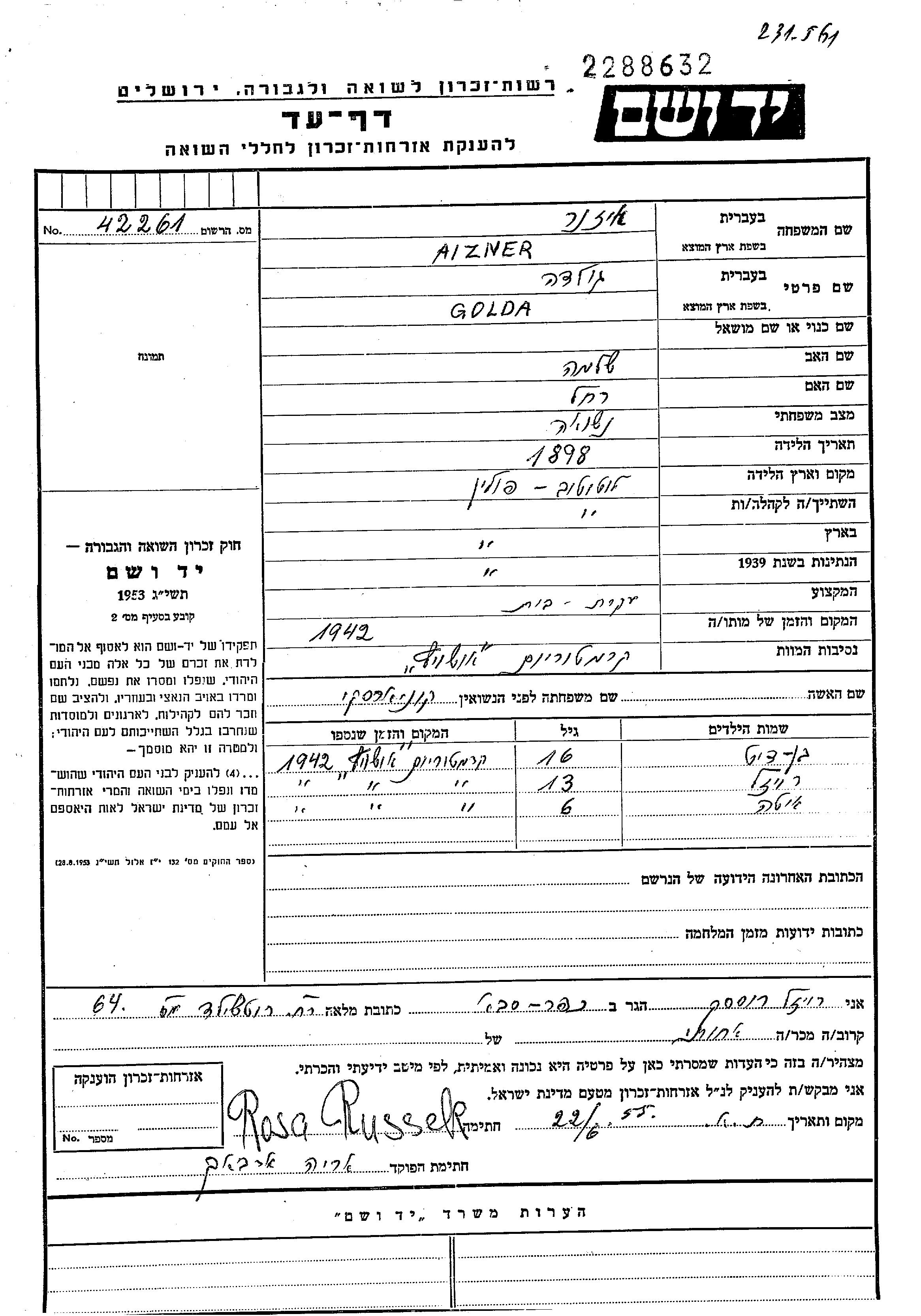 Aizner Golda 1898 Lututow, Poland Page of Testimony