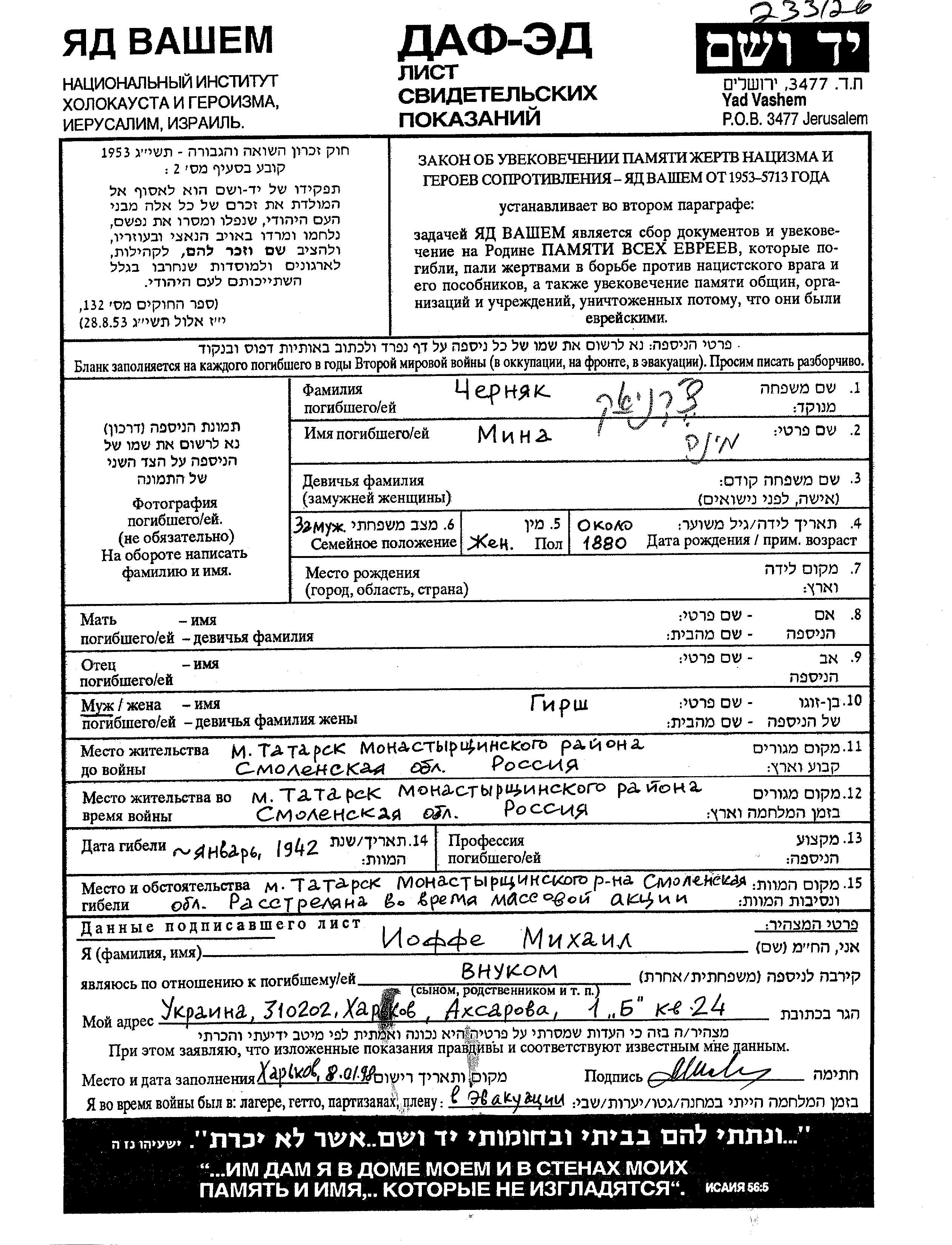 Mina Chernyak was born, 1880. She was married to Girsh. Prior to WWII she lived in Tatarsk, Russia (USSR). During the war she was in Tatarsk, Russia (USSR). Mina was murdered in the Shoah. Place of death: Tatarsk, Russia (USSR), 1942.