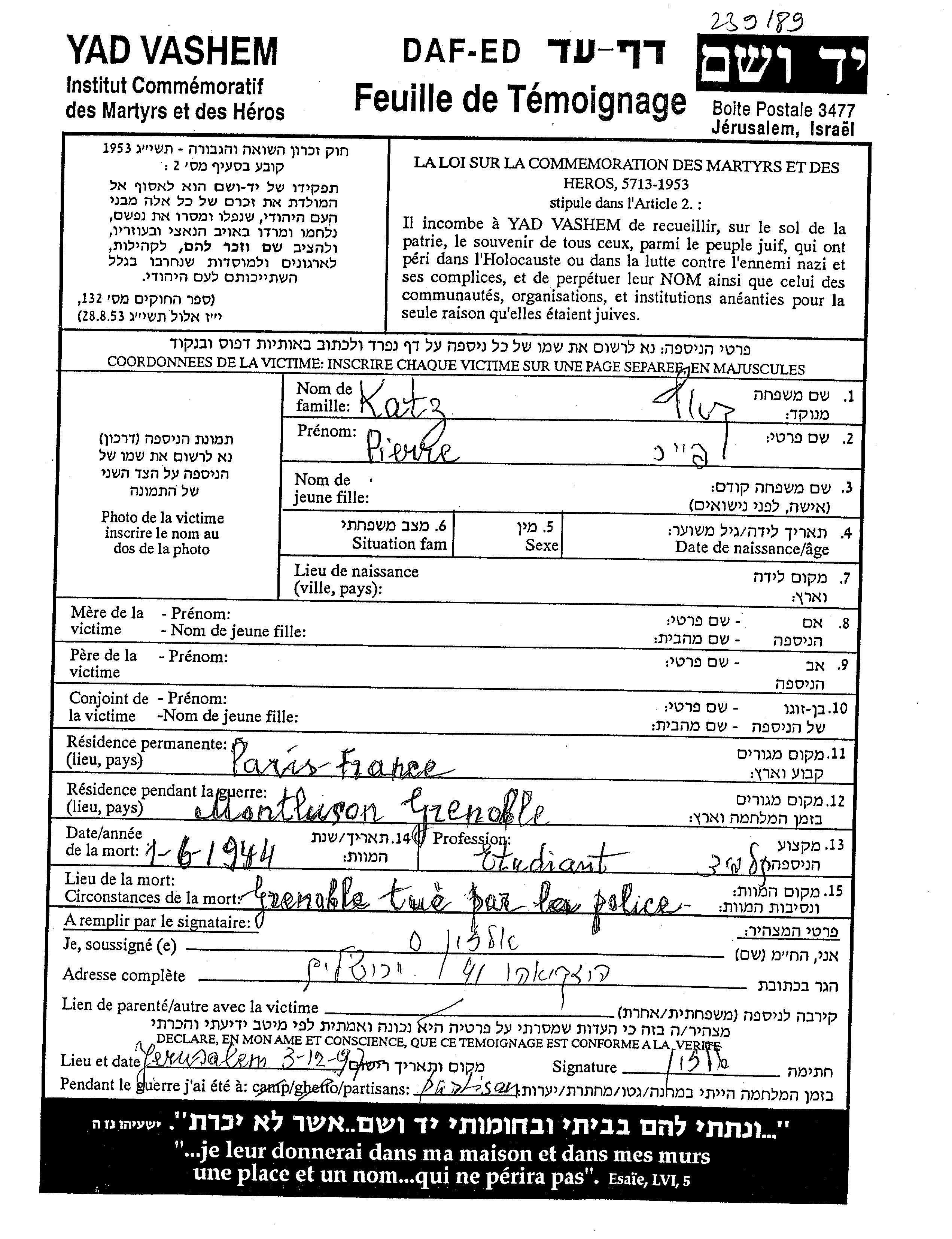 Pierre Katz. He was a student. Prior to WWII he lived in Paris, France. During the war he was in Grenoble, France.