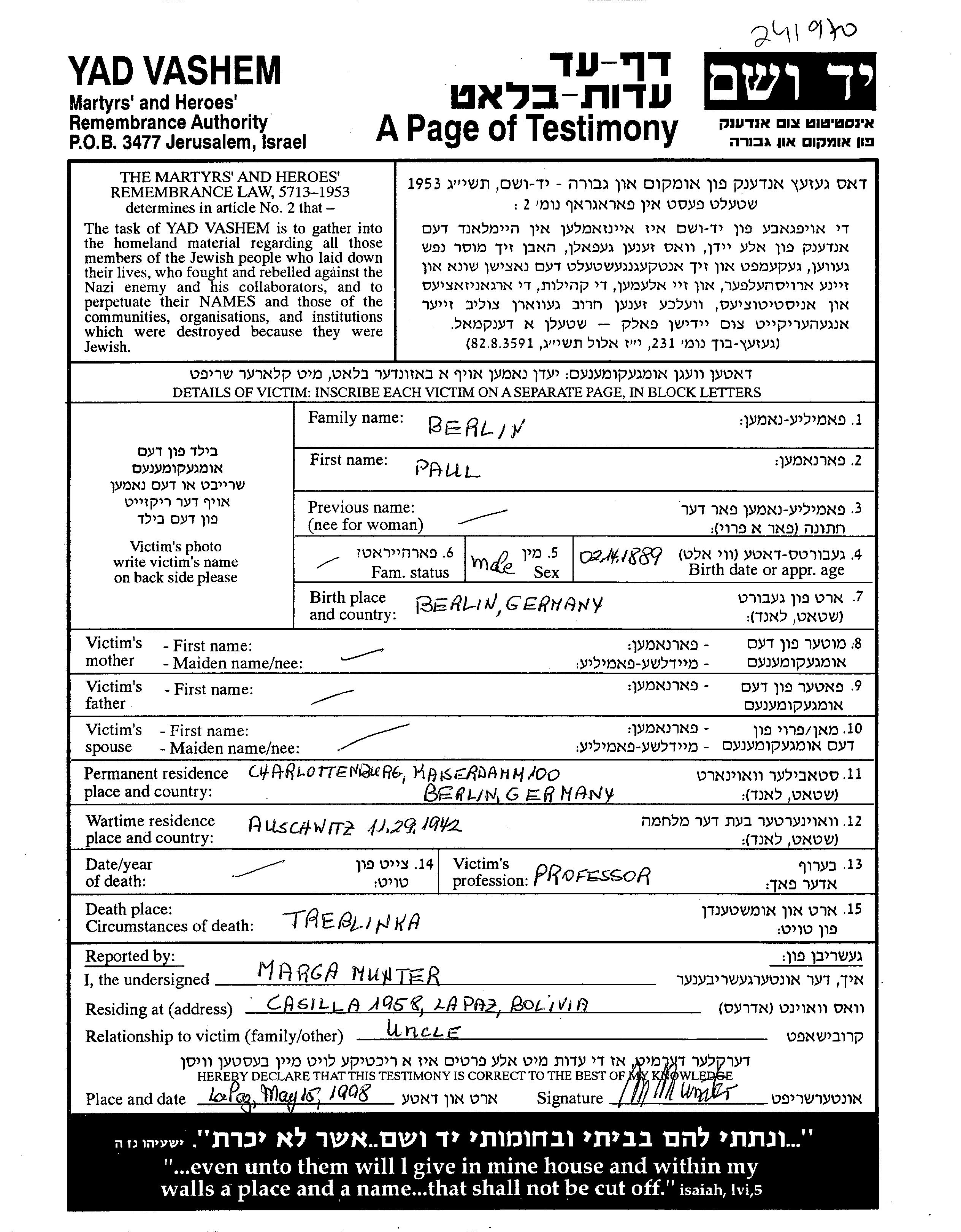 Berlin Paul 1889 Charlottenburg, Germany Page of Testimony