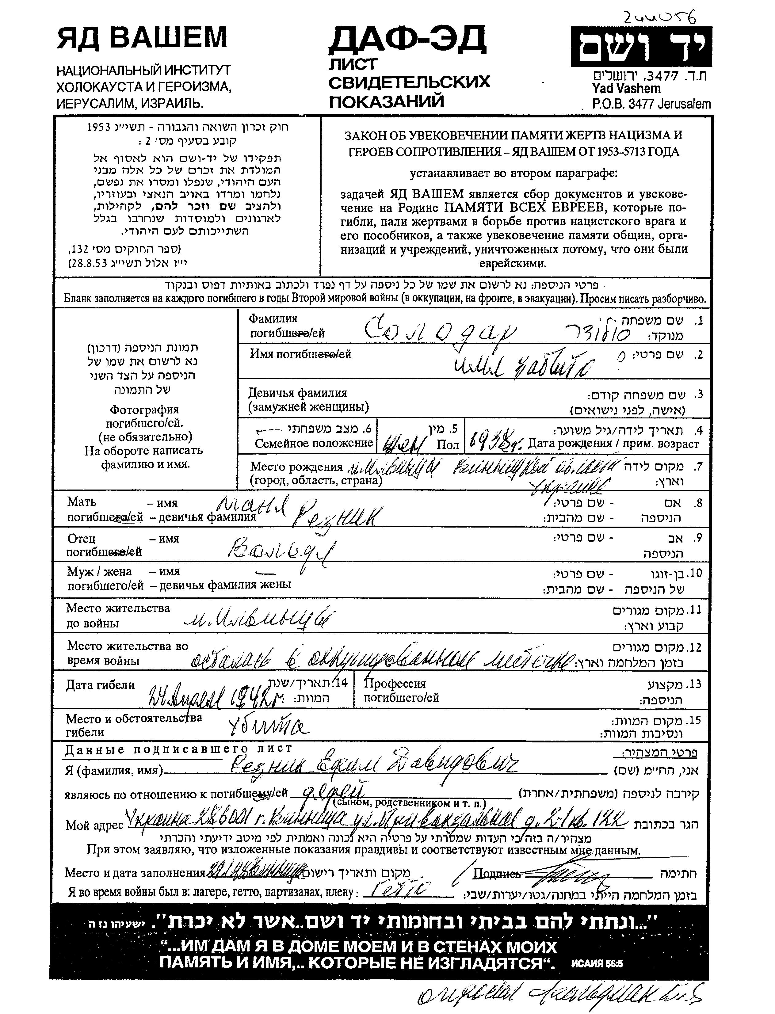 First name unknown Solodar was born in Ilyintsy, Ukraine (USSR), 1938 to Volodya and Manya nee Reznik. She was child. Prior to WWII she lived in Ilyintsy, Ukraine (USSR). During the war she was in Ilyintsy, Ukraine (USSR). She was murdered in the Shoah. Place of death: unknown, 24/04/1942.