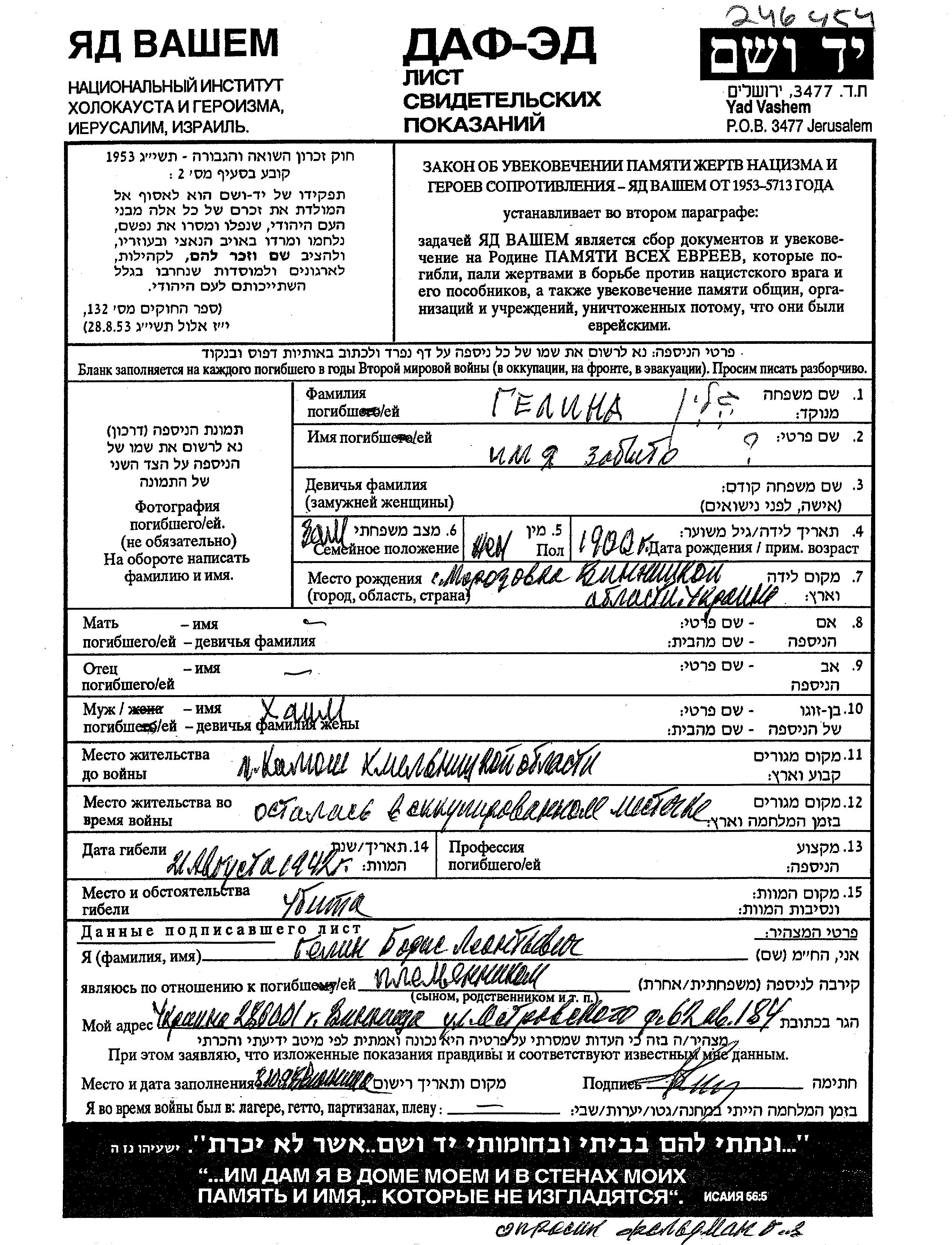 First name unknown Gelin Galin was born in Morozovka, Ukraine (USSR), 1900. She was married to Khaim. Prior to WWII she lived in Kalyus, Ukraine (USSR). During the war she was in Kalyus, Ukraine (USSR). She was murdered in the Shoah. Place of death: unknown, 21/08/1942.
