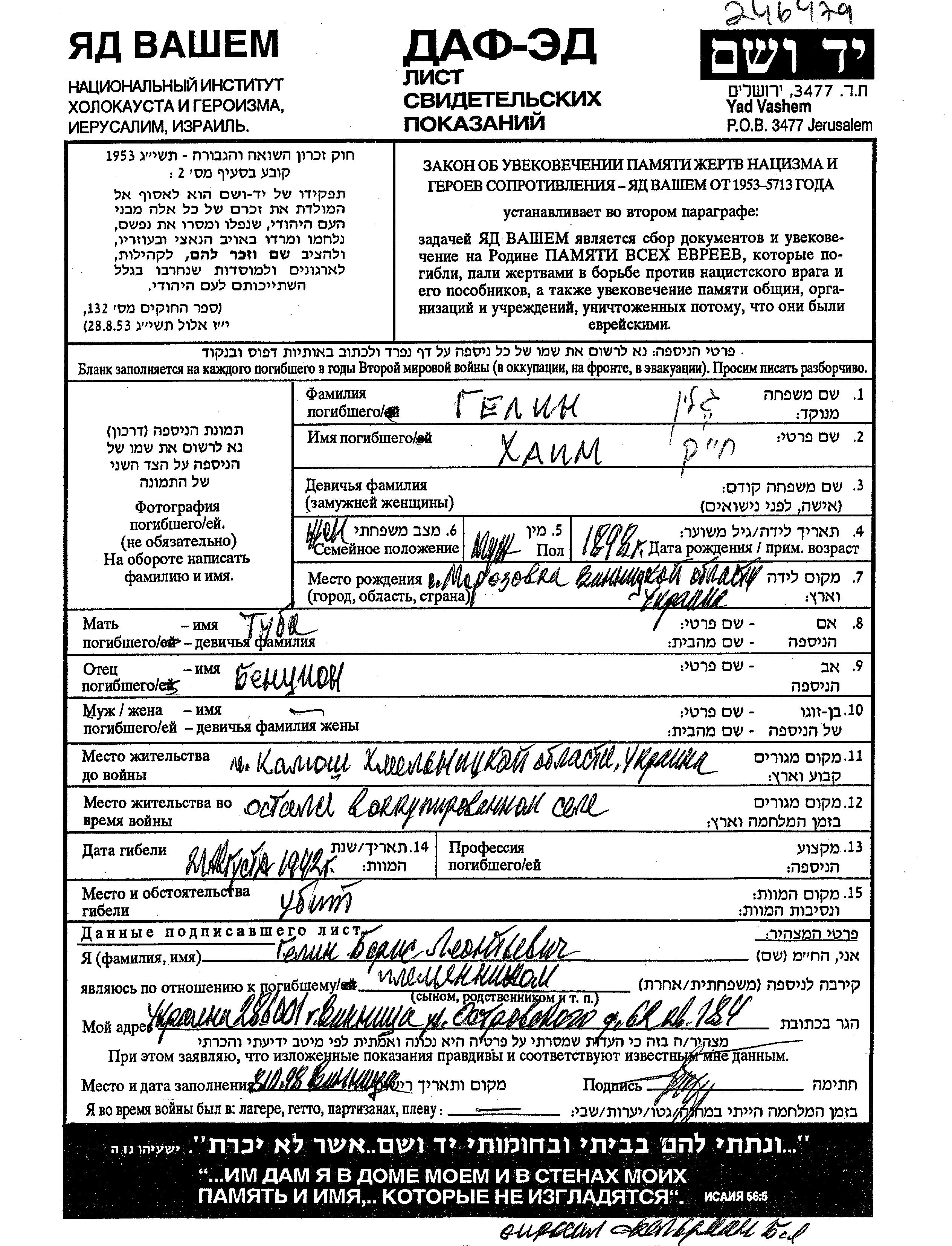 Khaim Gelin Galin was born in Morozovka, Ukraine (USSR), 1898 to Bentzion and Tuba Tova. He was married. Prior to WWII he lived in Kalyus, Ukraine (USSR). During the war he was in Kalyus, Ukraine (USSR). Khaim was murdered in the Shoah. Place of death: unknown, 21/08/1942.