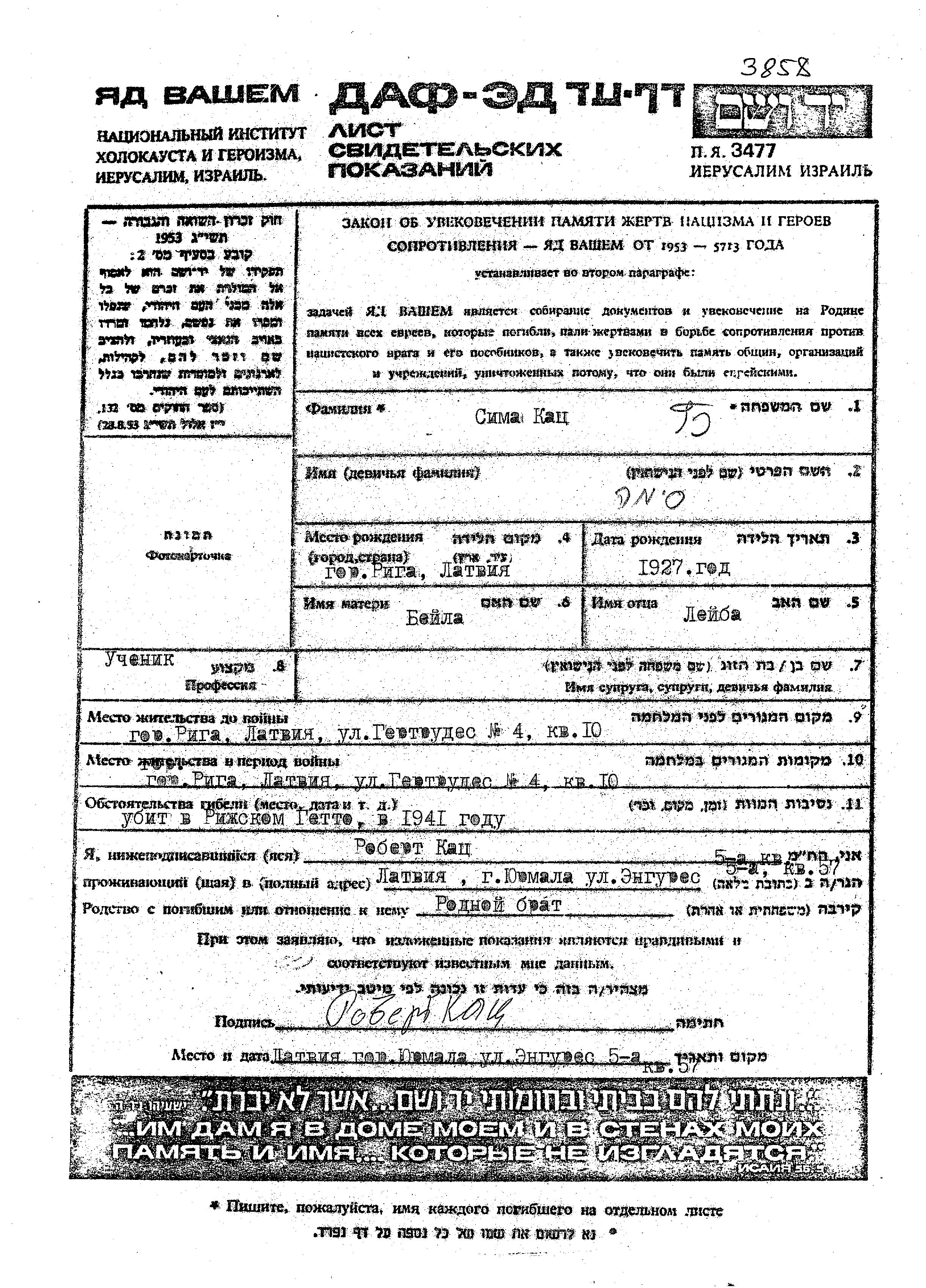 Sima Katz was born in Riga, Latvia, 1927 to Leiba and Beila nee Yankelovich. She was a pupil and child. Prior to WWII she lived in Riga, Latvia. During the war she was in Riga, Latvia. Sima was murdered in the Shoah. Place of death: Riga, Latvia, 1941.