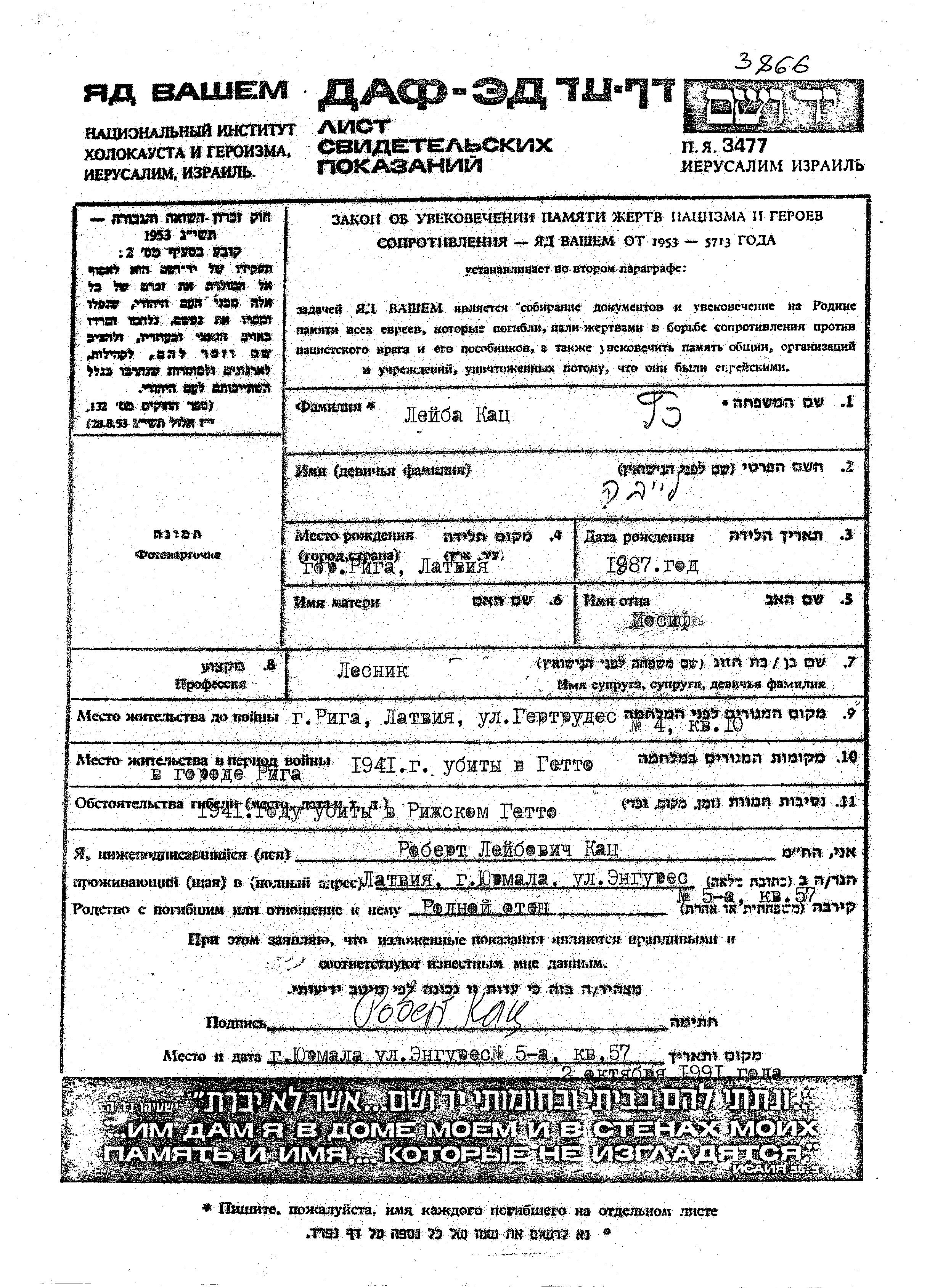 Leiba Katz was born in Riga, Latvia, 1887 to Yosif. He was a forester and married to Beila. Prior to WWII he lived in Riga, Latvia. During the war he was in Riga, Latvia.