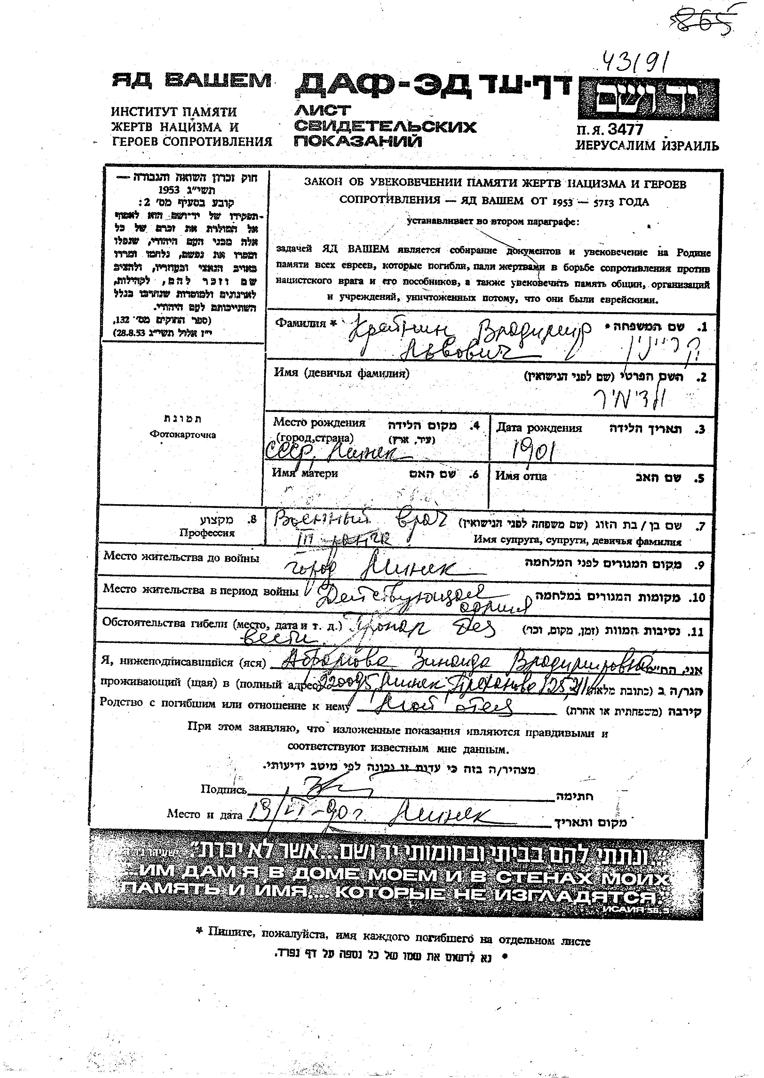 Kreinin Vladimir 1901 Minsk, Belorussia (USSR) Page of Testimony