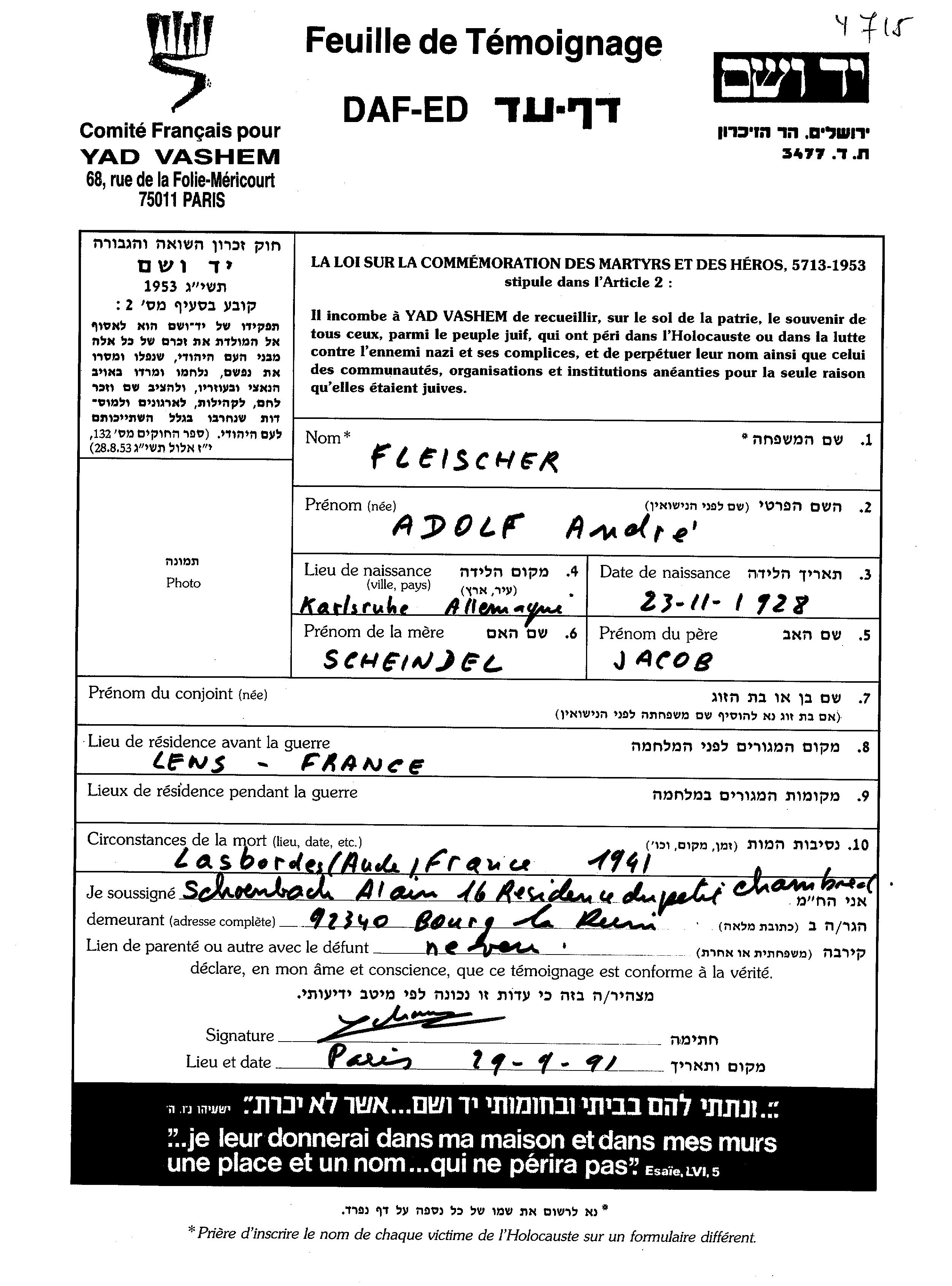 Andre Adolf Fleischer was born in Karlsruhe, Germany, 1928 to Jacob and Scheindel. He was child. Prior to WWII he lived in Lens, France. During the war he was in France. Andre Adolf was murdered in the Shoah. Place of death: Lasbordes, France, 1941.