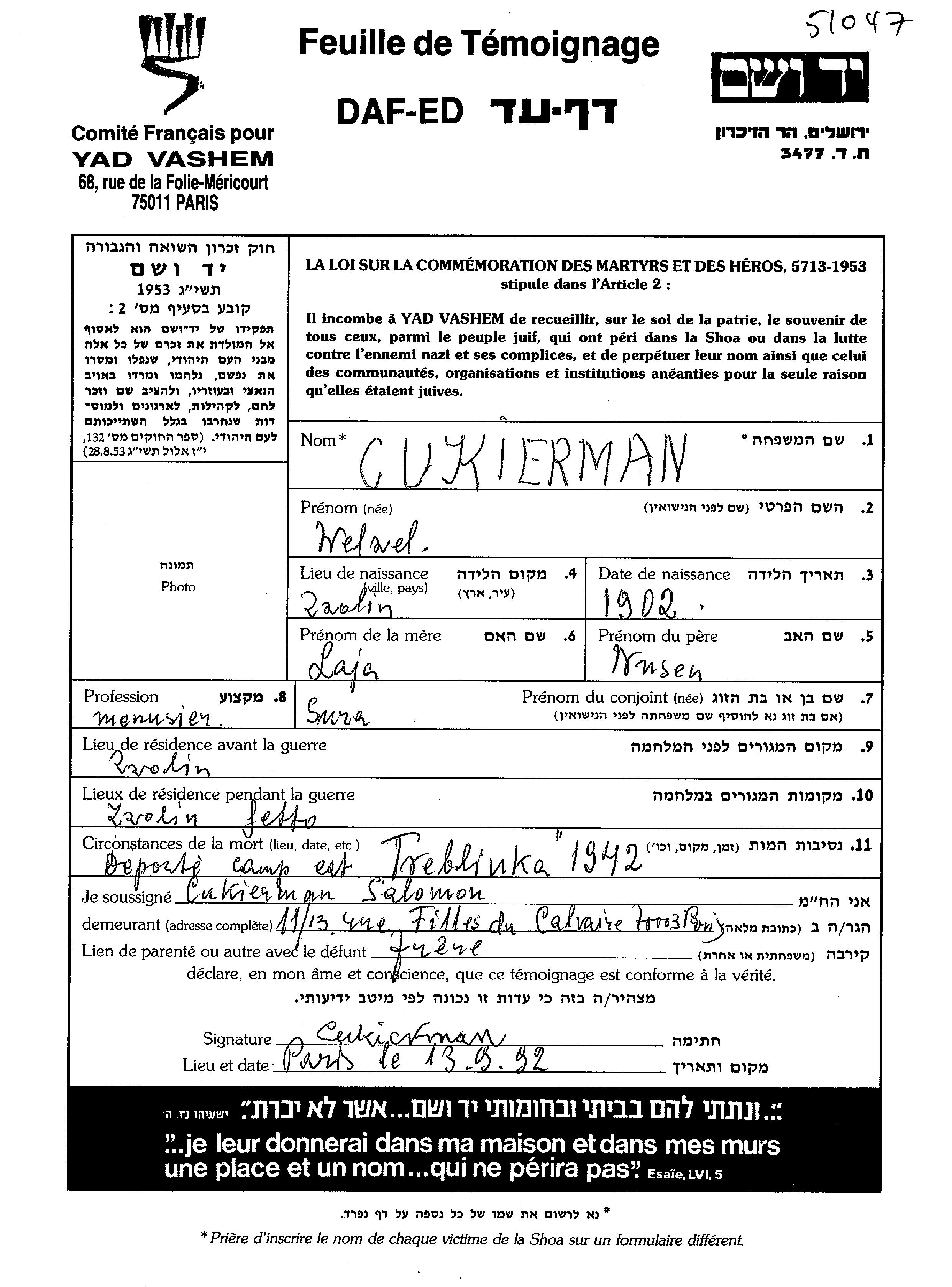 Cukierman Welwel 1902 Zwolin, Poland Page of Testimony