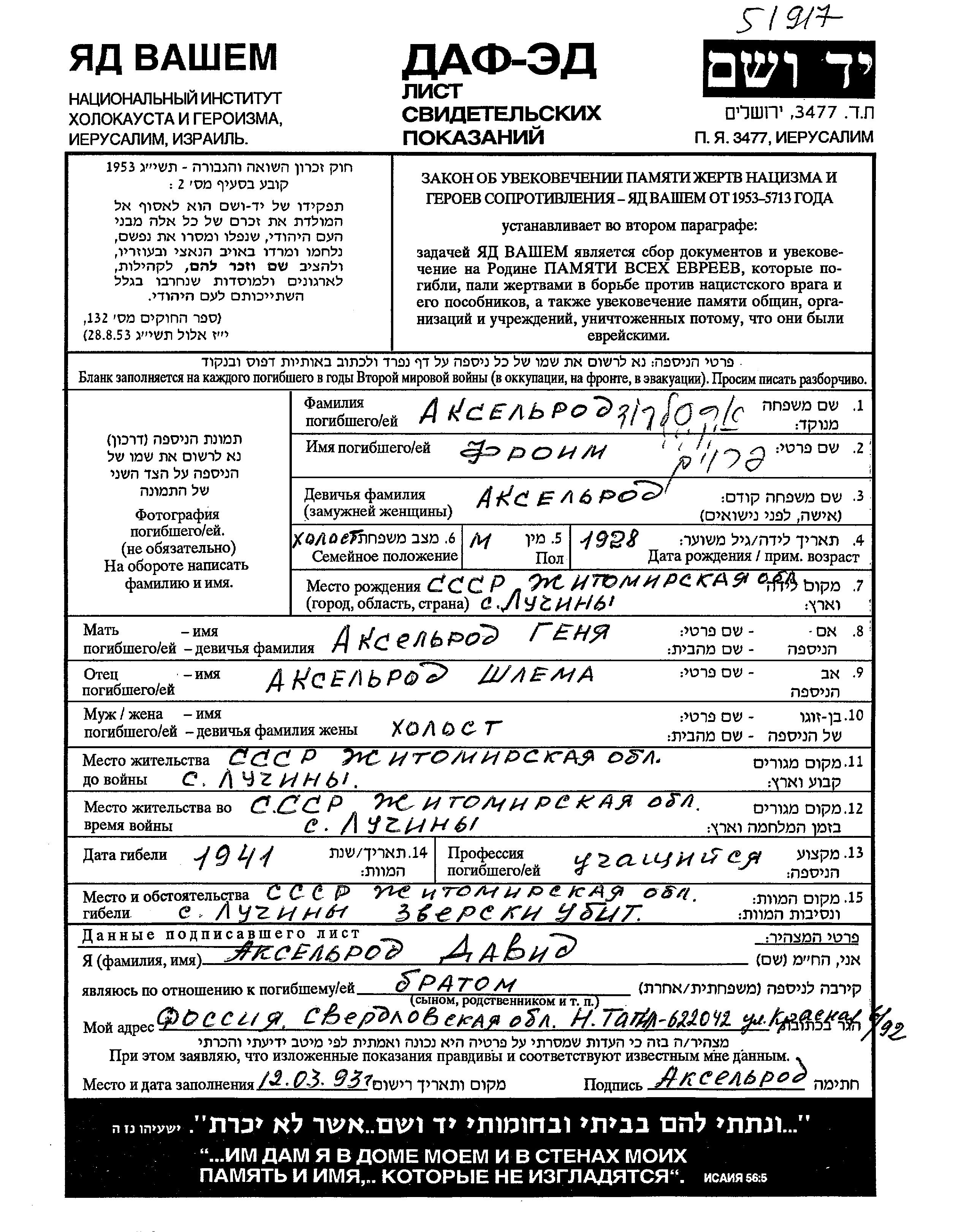 Froim Akselrod was born in Luginy, Ukraine (USSR), 1928 to Shlema and Genia. He was a pupil and child. Prior to WWII he lived in Luginy, Ukraine (USSR). During the war he was in Luginy, Ukraine (USSR). Froim was murdered in the Shoah. Place of death: Luginy, Ukraine (USSR), 1941.