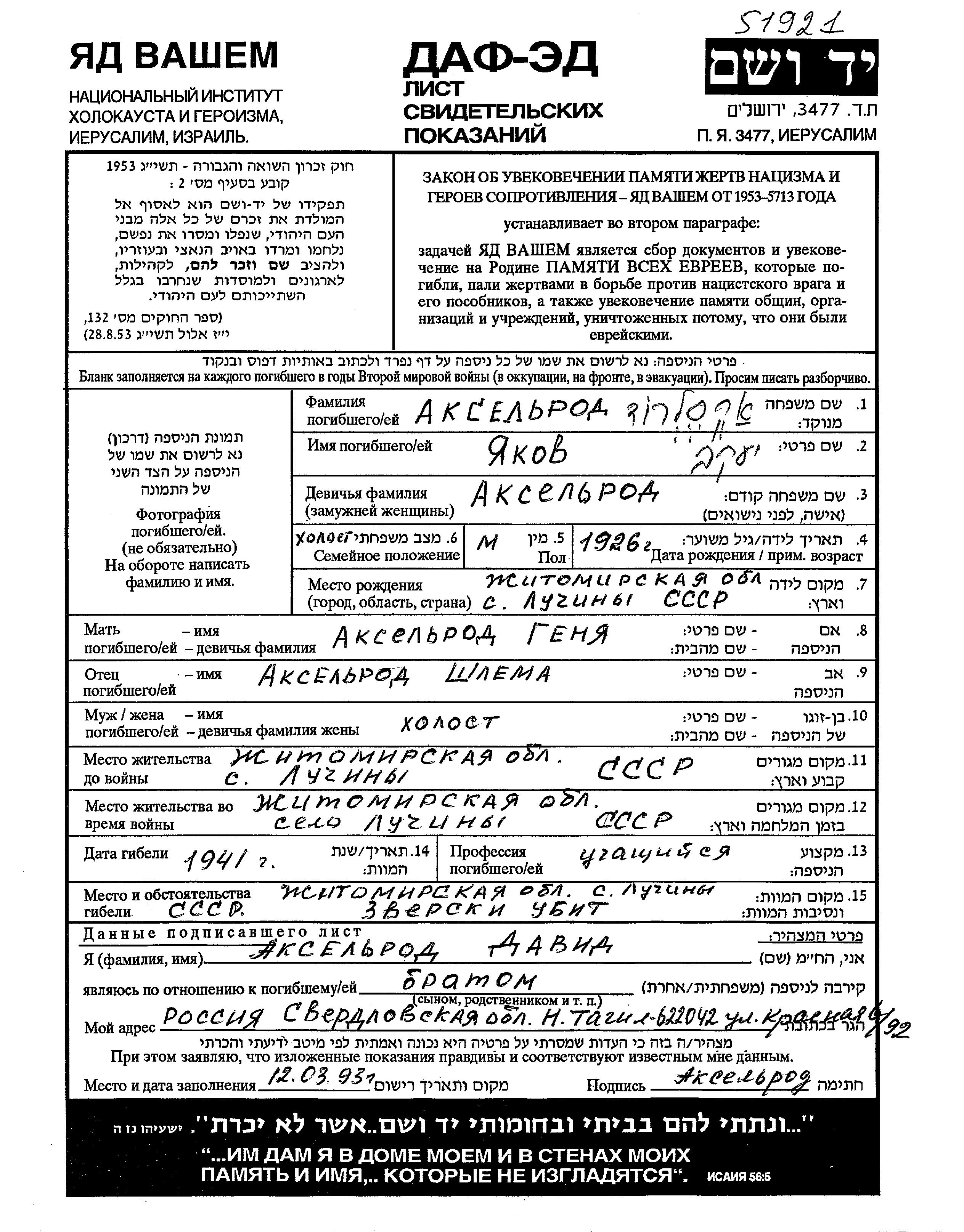 Yakov Akselrod was born in Luginy, Ukraine (USSR), 1926 to Shlema and Genia. He was a pupil and child. Prior to WWII he lived in Luginy, Ukraine (USSR). During the war he was in Luginy, Ukraine (USSR). Yakov was murdered in the Shoah. Place of death: Luginy, Ukraine (USSR), 1941.