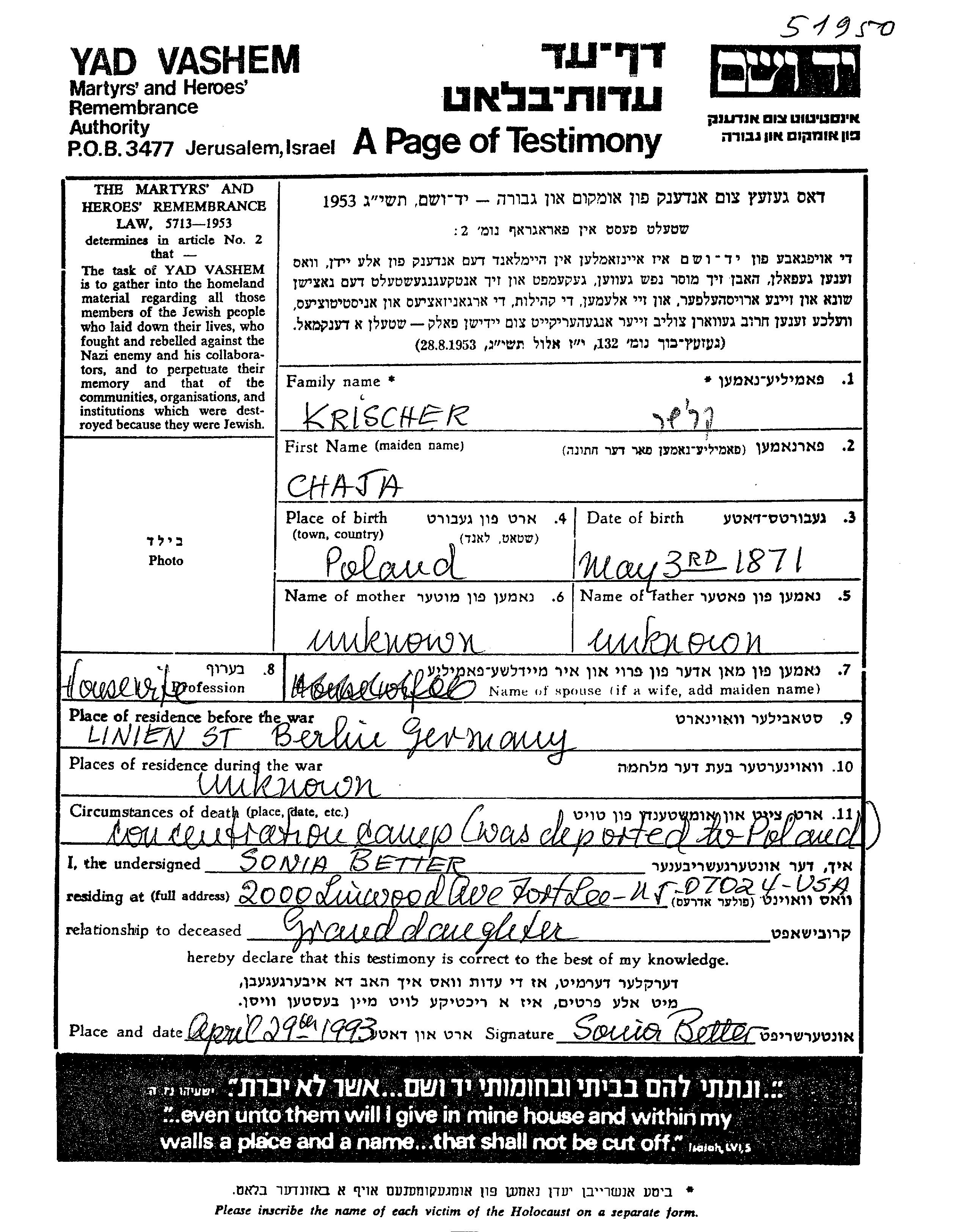 Krischer Chaja 1871 Berlin, Germany Page of Testimony