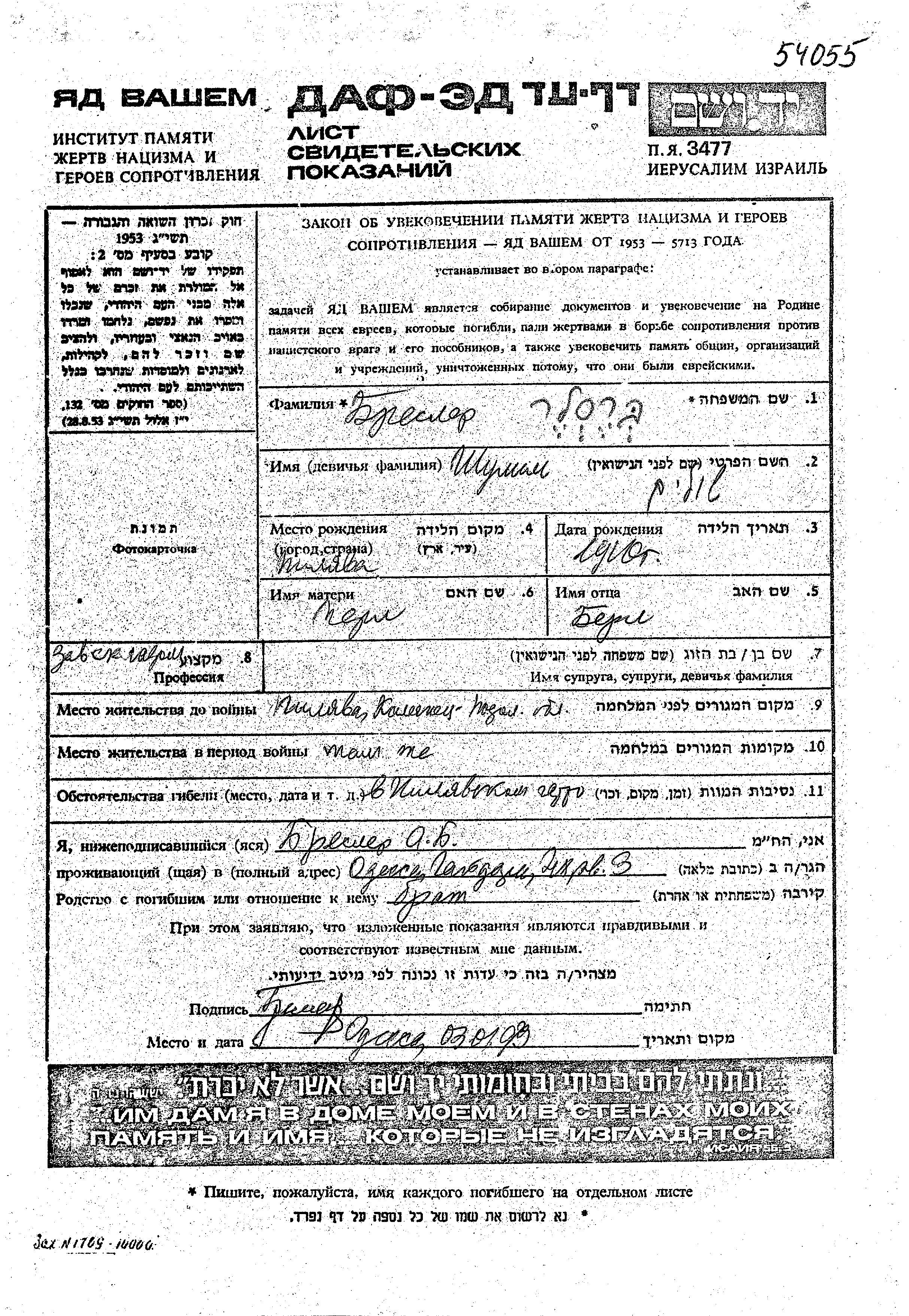 Bresler Shulim 1910 Pilyava, Ukraine (USSR) Page of Testimony