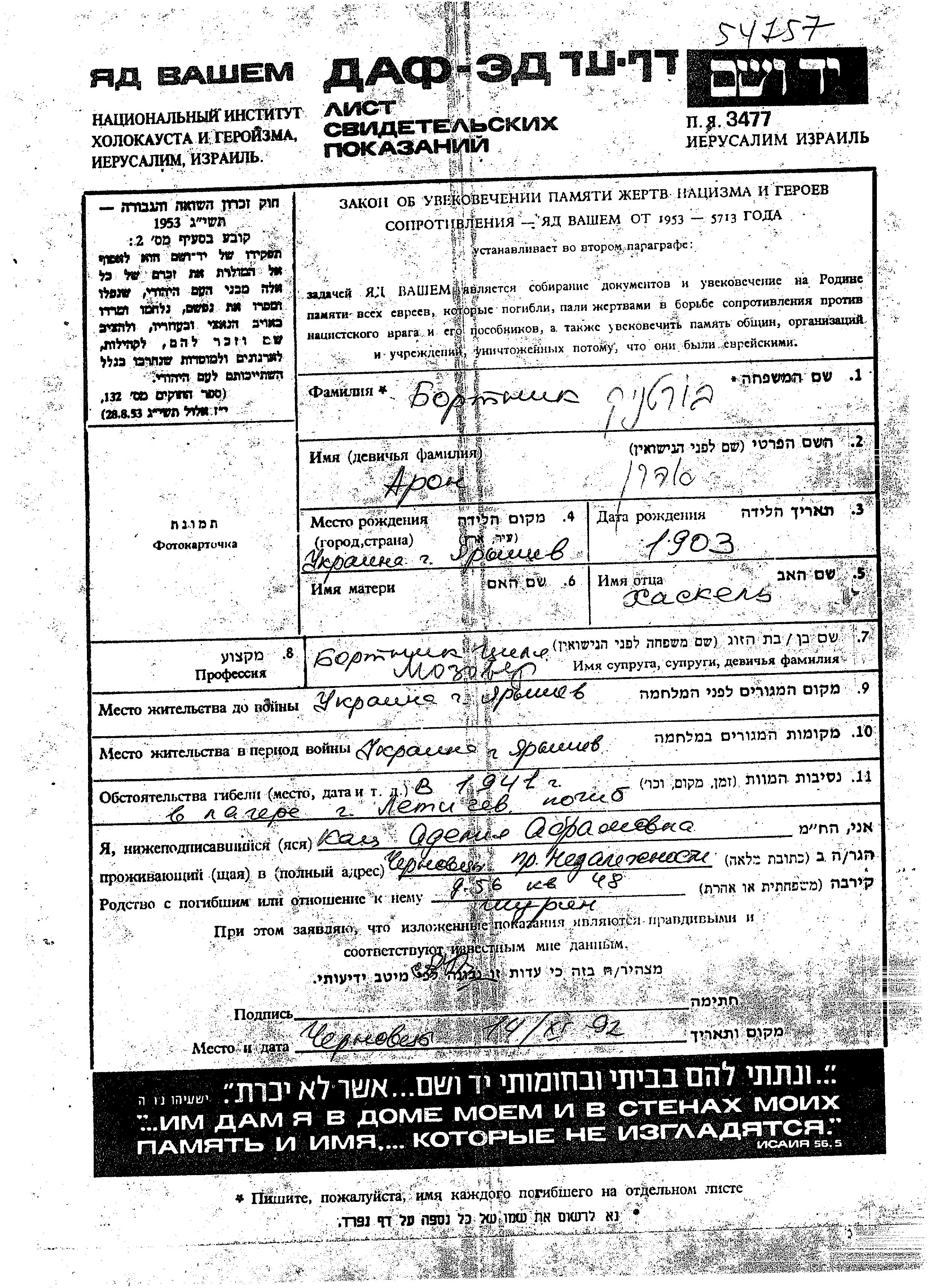 Aron Bortnik was born in Yaryshev, Ukraine (USSR), 1903 to Khaskel. He was married to Tzilia. Prior to WWII he lived in Yaryshev, Ukraine (USSR). During the war he was in Yaryshev, Ukraine (USSR). Aron was murdered in the Shoah. Place of death: Letichev, Ukraine (USSR), 1941.