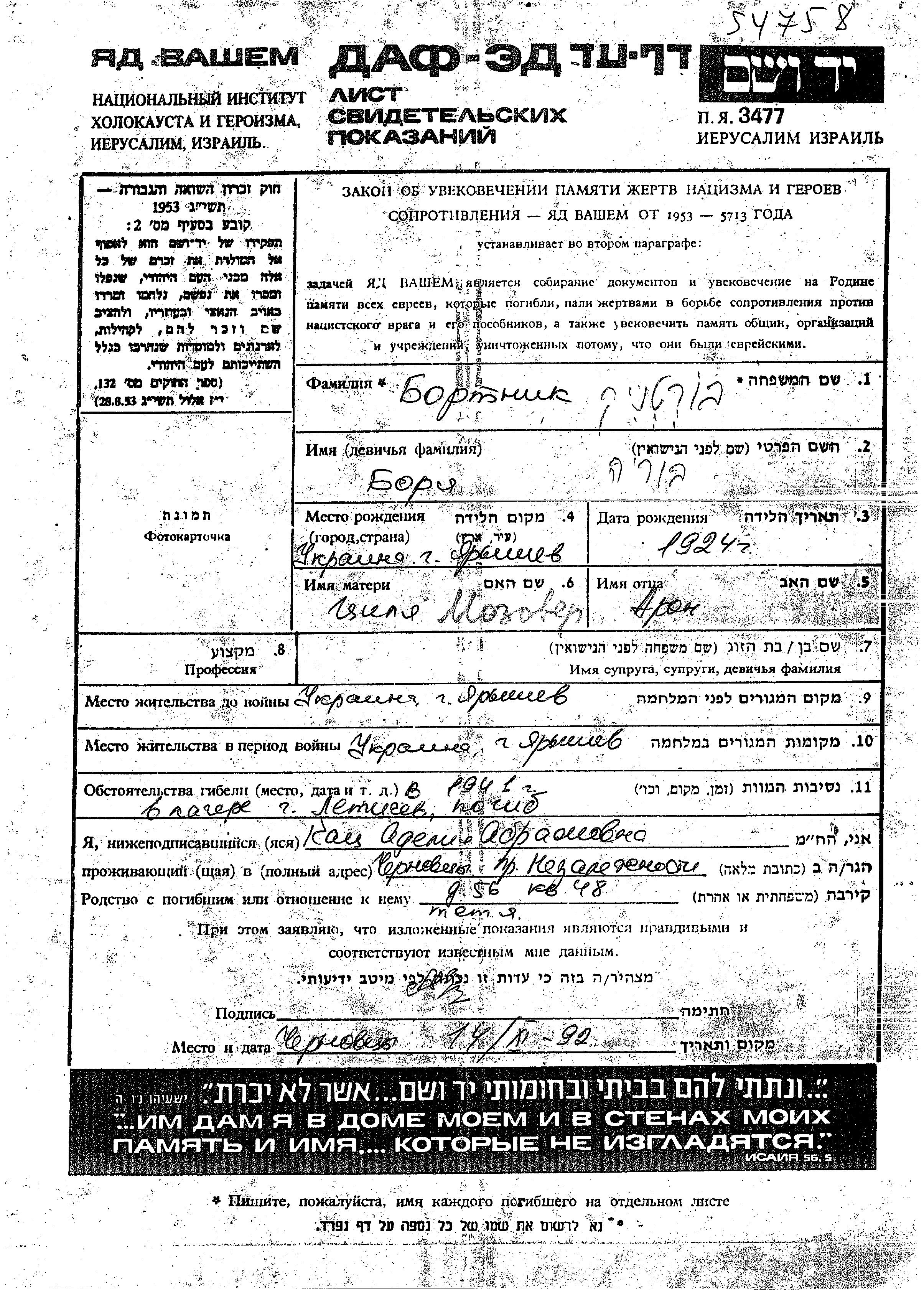 Boria Bortnik was born in Yaryshev, Ukraine (USSR), 1924 to Aron and Tzilia nee Mozover. He was child. Prior to WWII he lived in Yaryshev, Ukraine (USSR). During the war he was in Yaryshev, Ukraine (USSR). Boria was murdered in the Shoah. Place of death: Letichev, Ukraine (USSR), 1941.