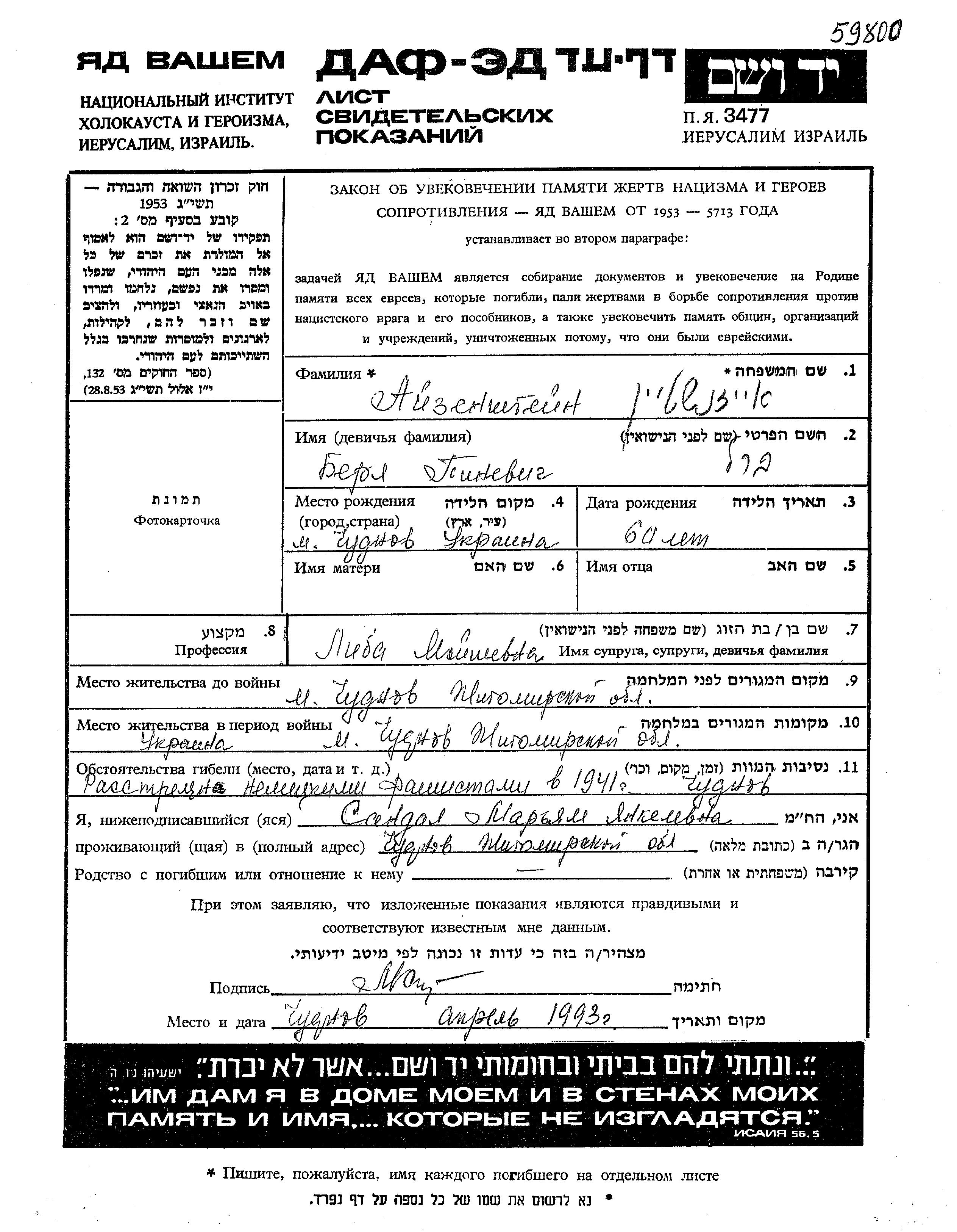Berl Aizenshtein was born in Chudnov, Ukraine (USSR), 1881. He was married to Liba. Prior to WWII he lived in Chudnov, Ukraine (USSR). During the war he was in Chudnov, Ukraine (USSR). Berl was murdered in the Shoah. Place of death: Chudnov, Ukraine (USSR), 1941.