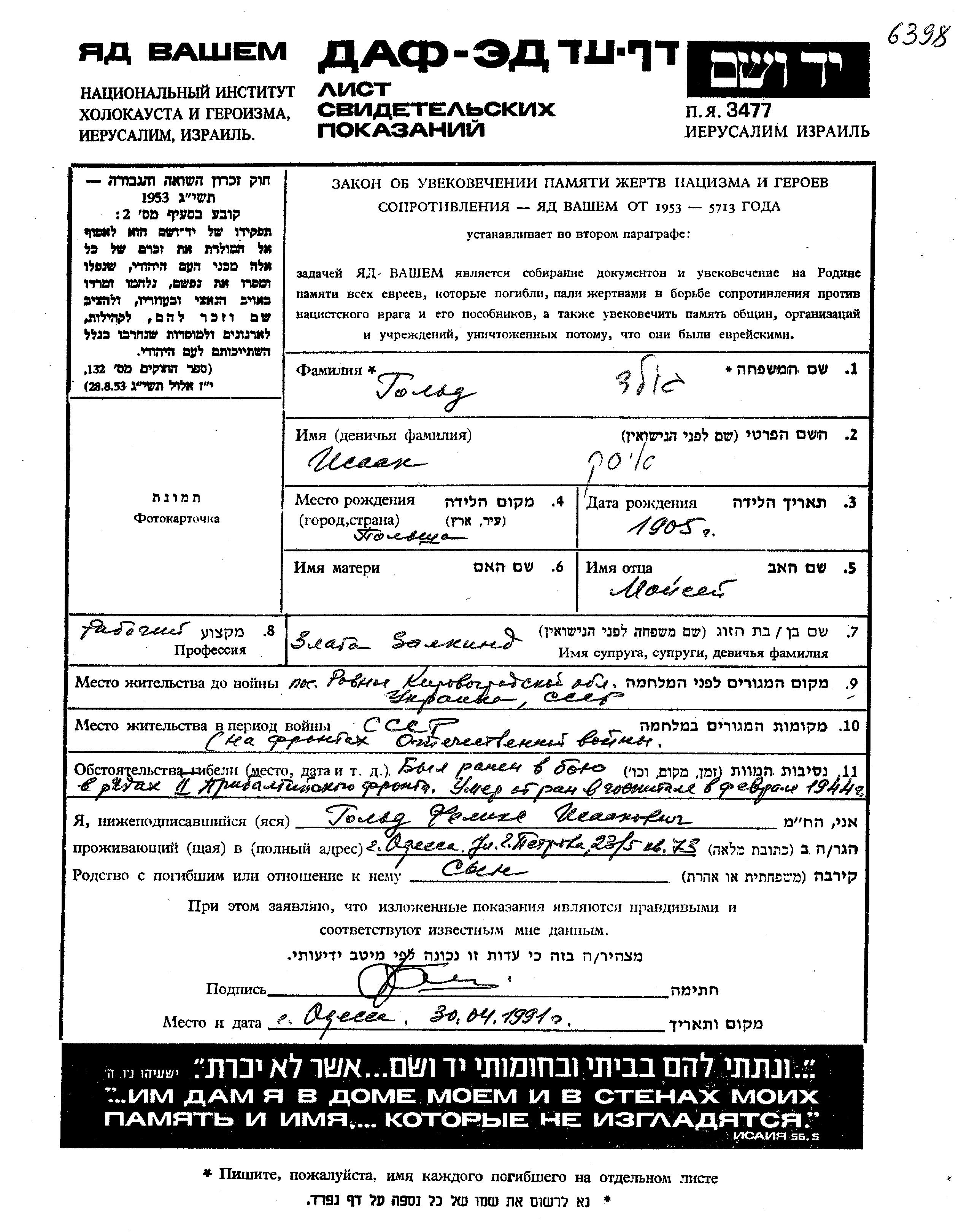 Isaak Gold was born in Poland, 1905 to Moisei. He was a worker and married to Zlata. Prior to WWII he lived in Rovnoye, Ukraine (USSR). During the war he was in the Soviet armed forces. Isaak was killed in military service in WWII. Place of death: unknown, 1944.