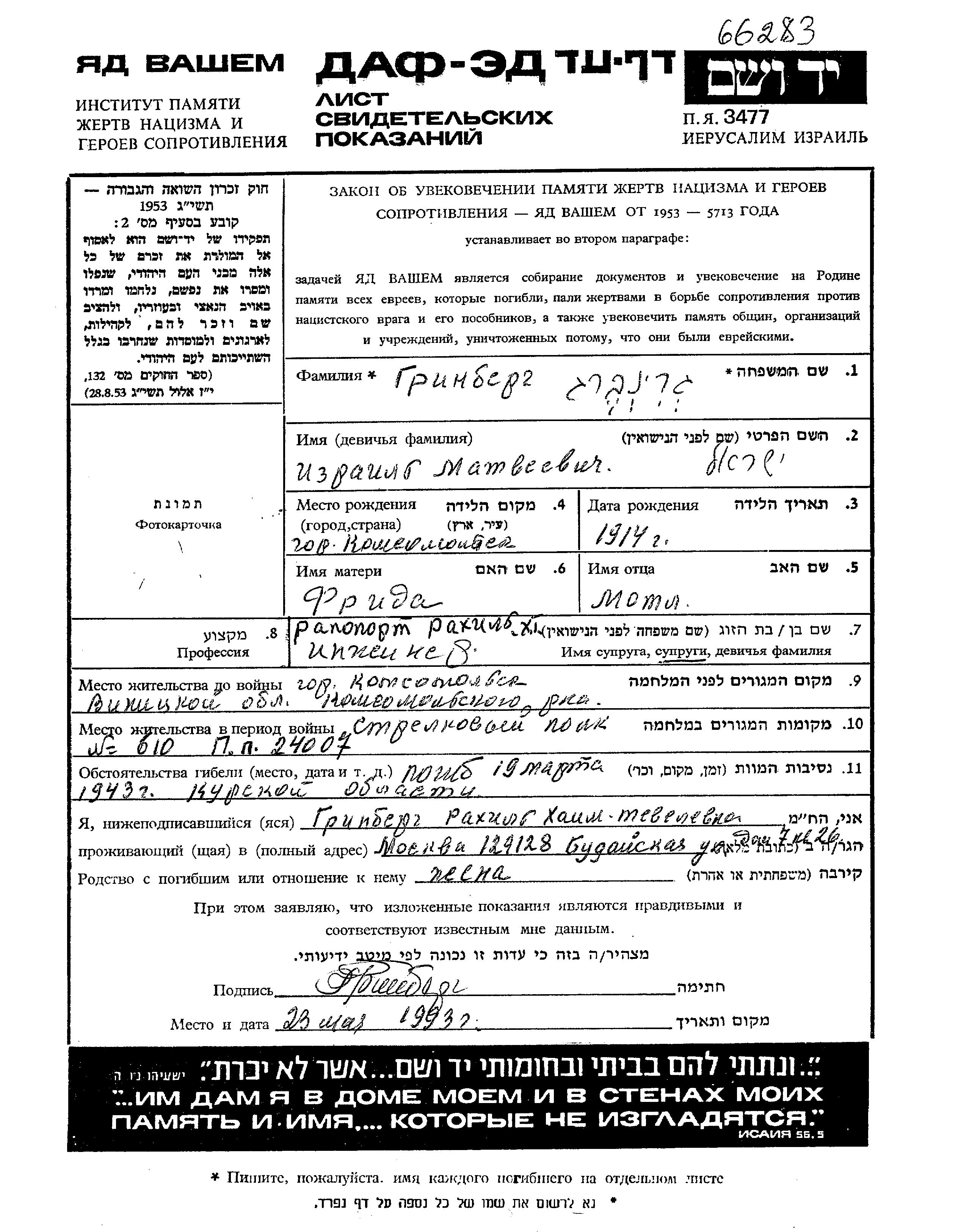 Izrail Grinberg was born in Komsomolskoye, Ukraine (USSR), 1914 to Motl and Frida. He was an engineer and married to Rakhil. Prior to WWII he lived in Komsomolskoye, Ukraine (USSR). During the war he was in the Soviet armed forces. Izrail was killed in military service in WWII. Place of death: Kursk, Russia (USSR), 19/03/1943.