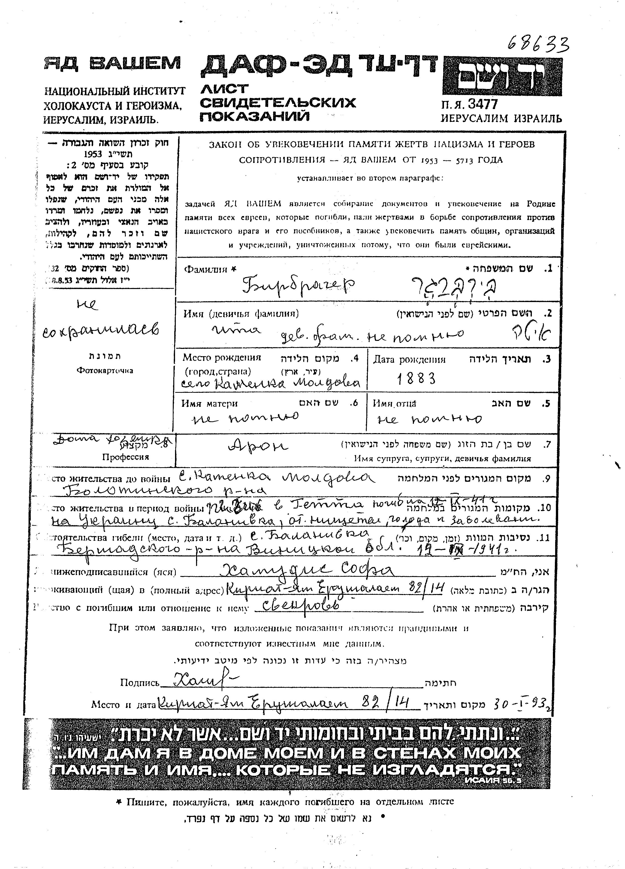 Ita Birbrager was born in Kamenka Moldavskaya, Ukraine (USSR), 1883. She was a housewife and married to Aron. Prior to WWII she lived in Kamenka Moldavskaya, Ukraine (USSR). During the war she was in Balanovka, Ukraine (USSR). Ita was murdered in the Shoah. Place of death: Balanovka, Ukraine (USSR), 12/09/1941.