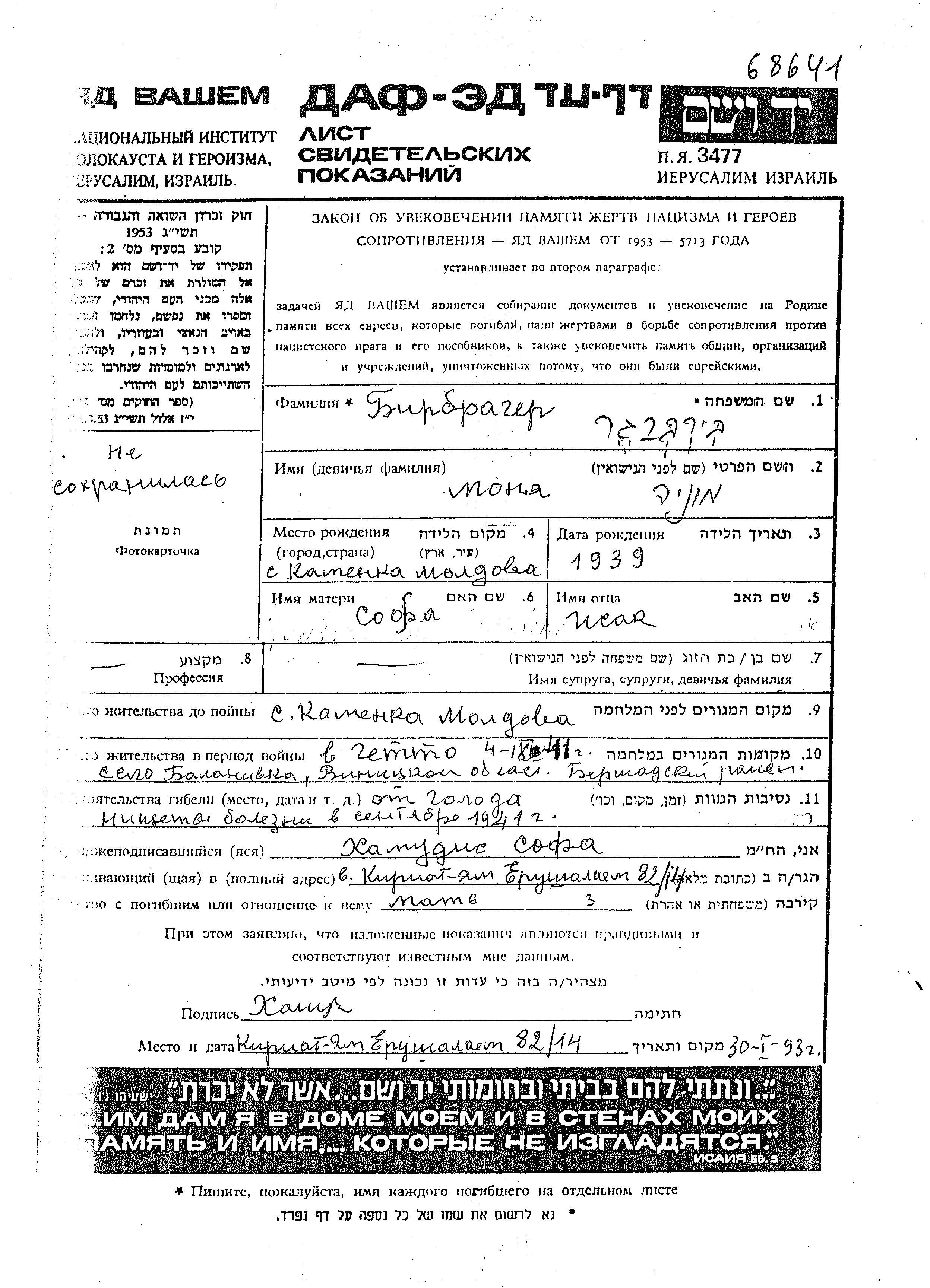 Monia Birbrager was born in Kamenka Moldavskaya, Ukraine (USSR), 1939 to Isak and Sofa nee Pinchevski. He was child. Prior to WWII he lived in Kamenka Moldavskaya, Ukraine (USSR). During the war he was in Balanovka, Ukraine (USSR). Monia was murdered in the Shoah. Place of death: Balanovka, Ukraine (USSR), 04/09/1941.