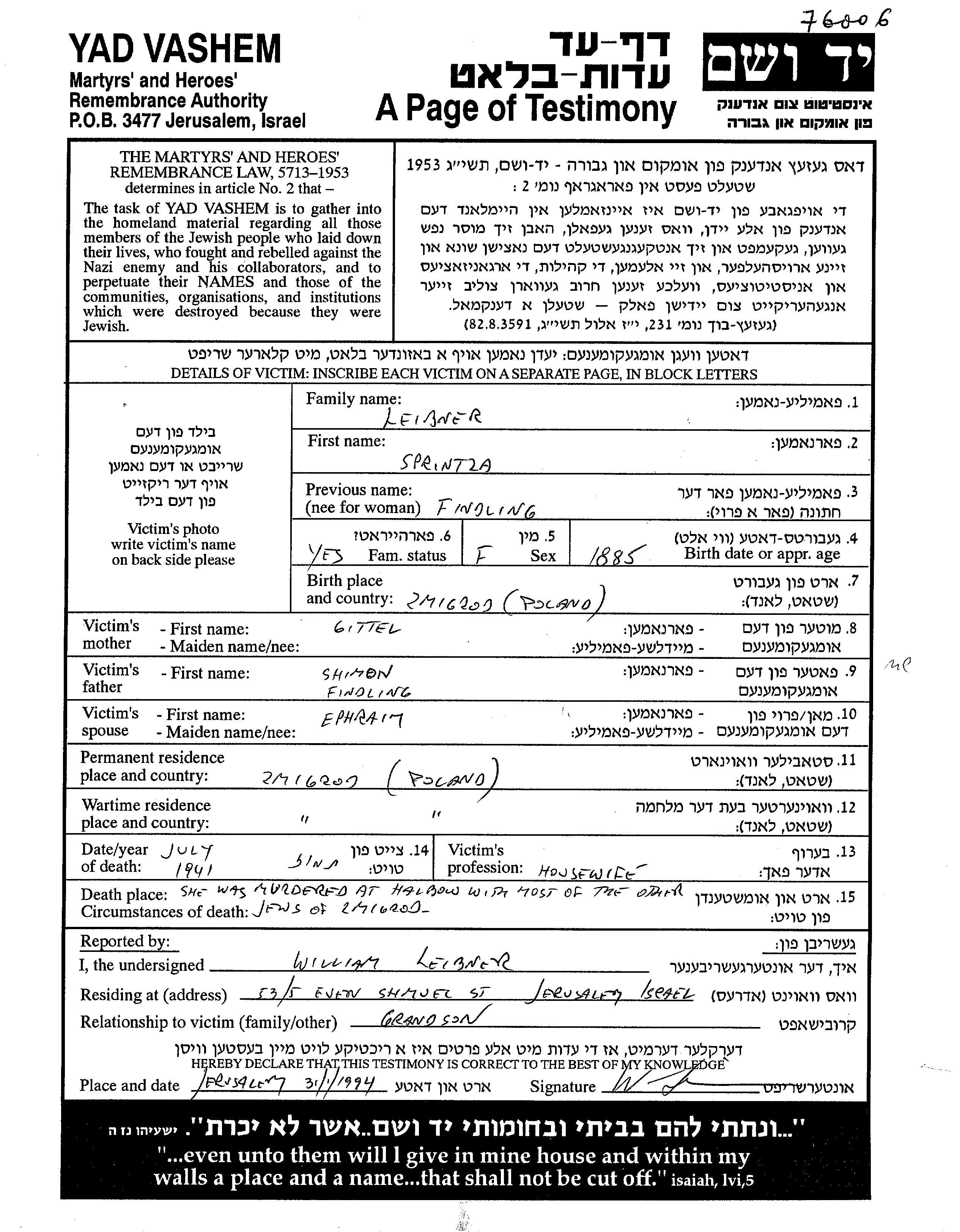 Sprintza Leibner nee Findling was born in Zmigrod Nowy, Poland, 1885 to Shimon and Gittel. She was a housewife. Prior to WWII she lived in Zmigrod Nowy, Poland. During the war she was in Zmigrod Nowy, Poland. Sprintza was murdered in the Shoah. Place of death: Halbow, Poland, 1941.