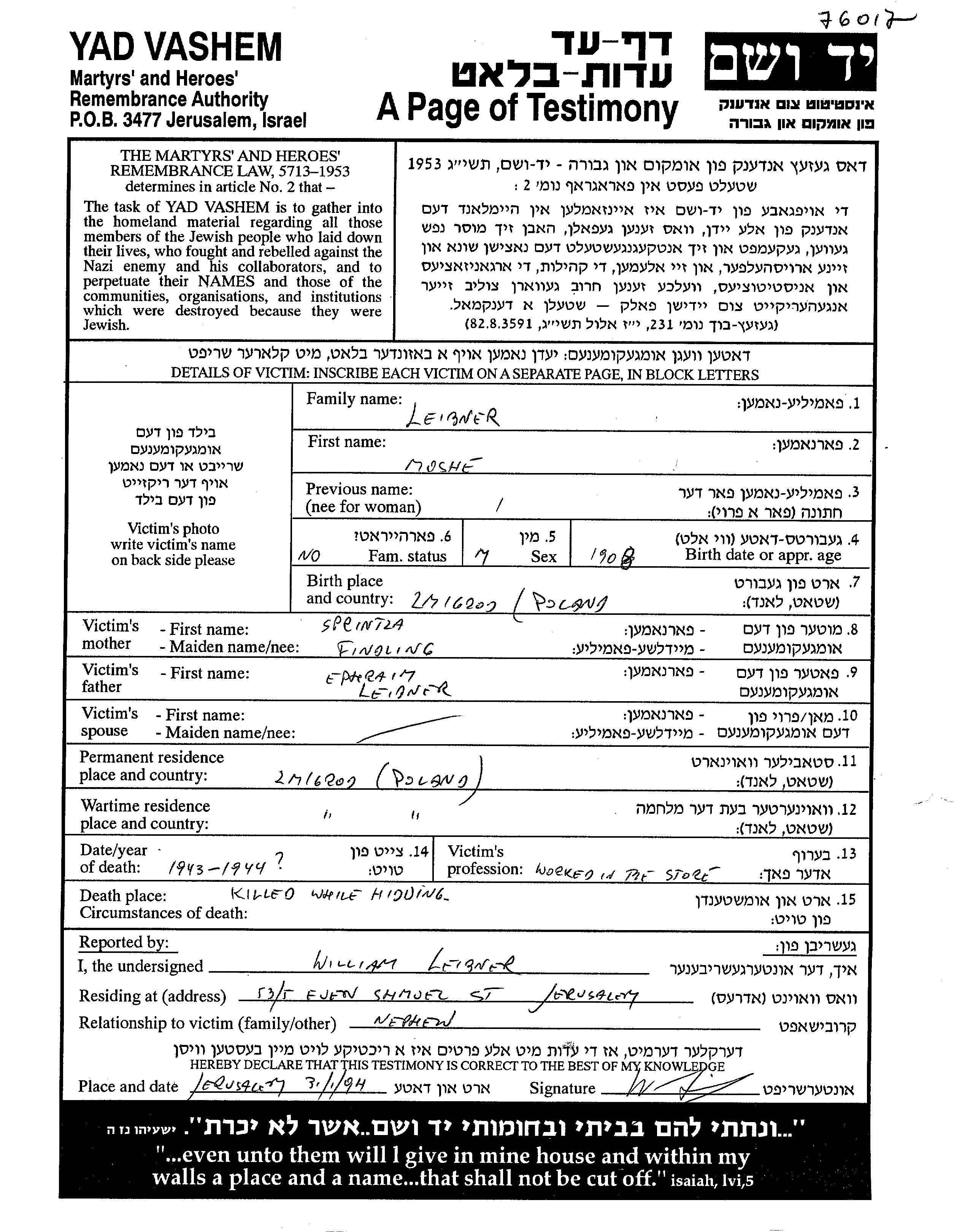 Moshe Leibner was born in Zmigrod Nowy, Poland, 1908 to Ephraim and Sprintza nee Findling. He was a sales person. Prior to WWII he lived in Zmigrod Nowy, Poland. During the war he was in Zmigrod Nowy, Poland. Moshe was murdered in the Shoah. Place of death: unknown, 1944.