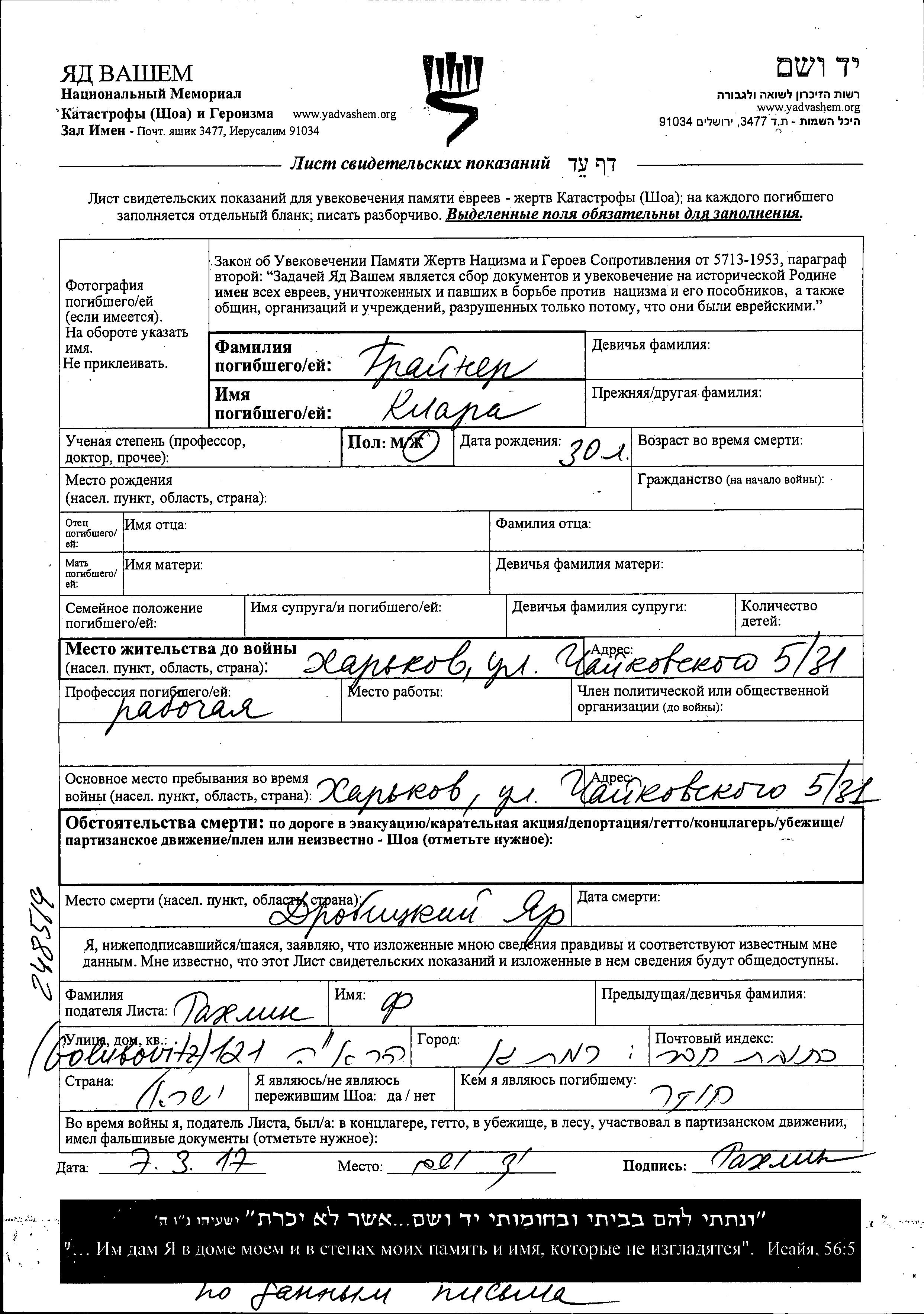 Klara Grayner. She was a worker. Prior to WWII she lived in Kharkov, Ukraine (USSR). During the war she was in Kharkov, Ukraine (USSR). Klara was murdered in the Shoah. Place of death: Drobitskiy Yar (Kharkov), Ukraine (USSR).