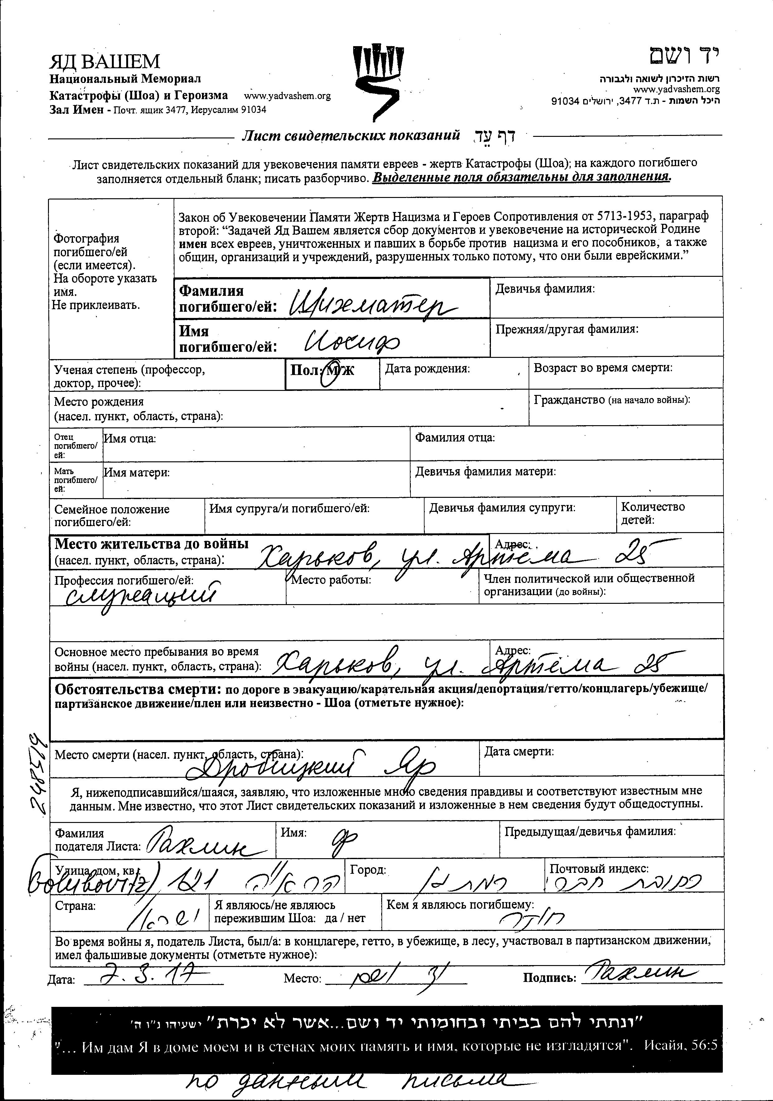 Iosif Shikhmater. He was an employee. Prior to WWII he lived in Kharkov, Ukraine (USSR). During the war he was in Kharkov, Ukraine (USSR). Iosif was murdered in the Shoah. Place of death: Drobitskiy Yar (Kharkov), Ukraine (USSR).