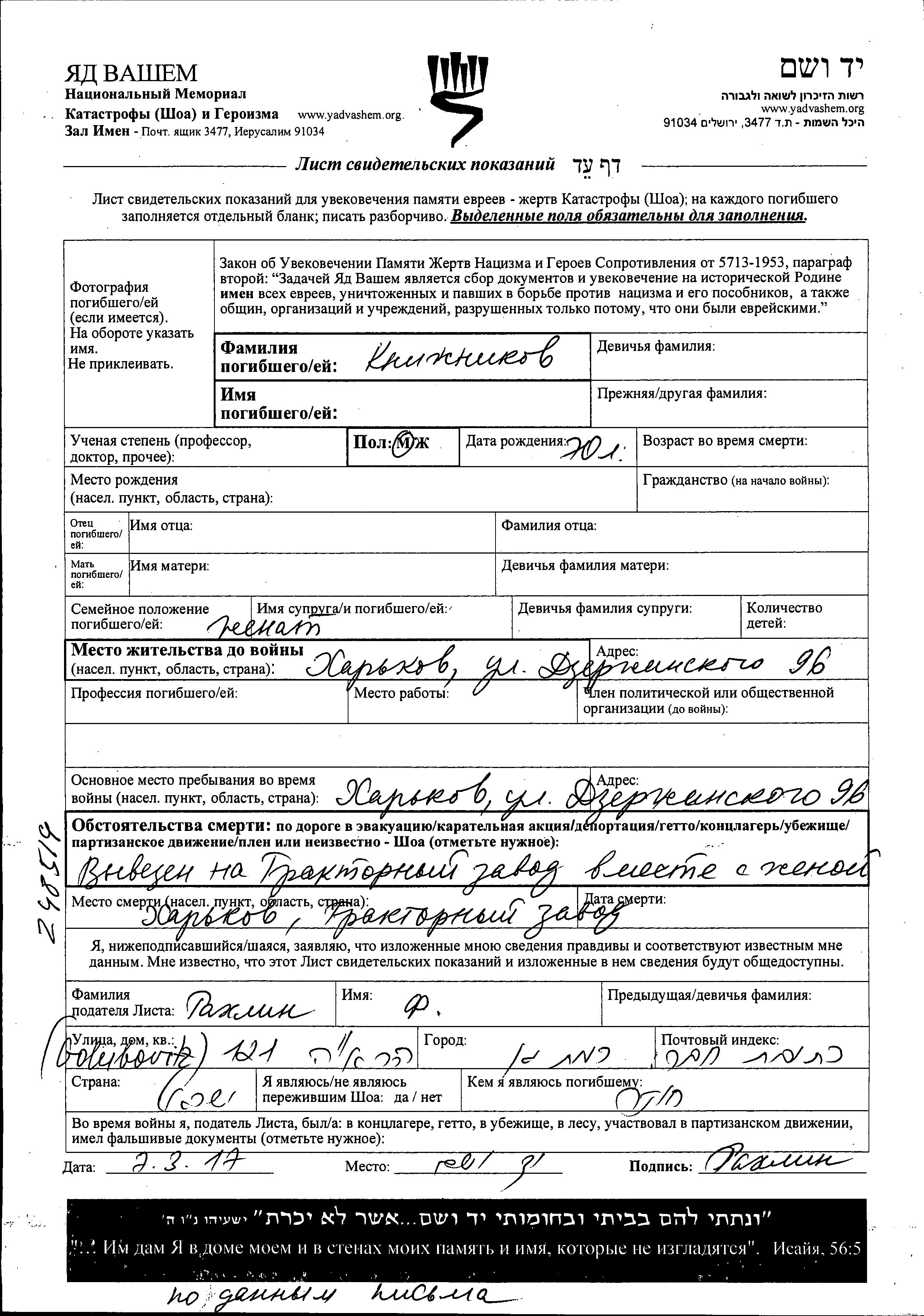 First name unknown Knizhnikov. He was married. Prior to WWII he lived in Kharkov, Ukraine (USSR). During the war he was in Kharkov, Ukraine (USSR). He was murdered in the Shoah. Place of death: Traktorny Zavod Kharkov, Ukraine (USSR).