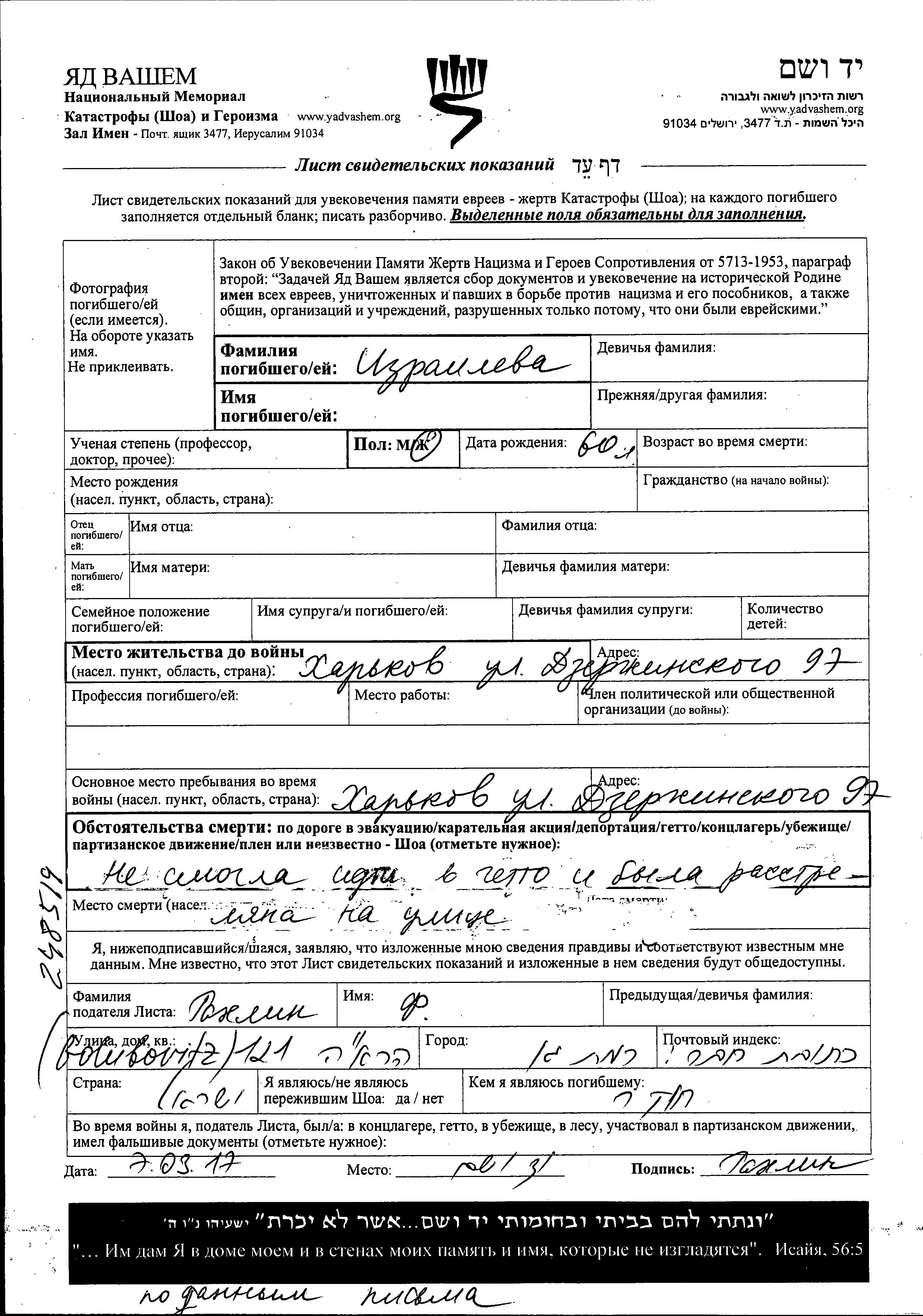 First name unknown Izraileva. Prior to WWII she lived in Kharkov, Ukraine (USSR). During the war she was in Kharkov, Ukraine (USSR). She was murdered in the Shoah. Place of death: Kharkov, Ukraine (USSR).