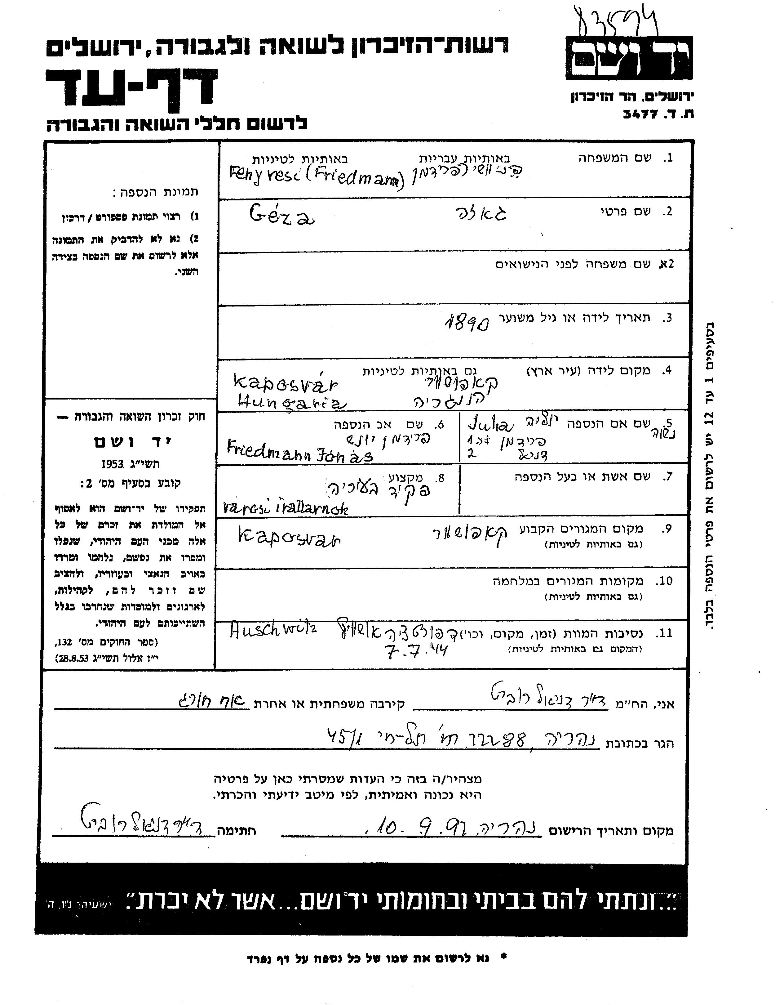 Fenyvesi Friedmann Geza 1890 Kaposvar, Hungary Page of Testimony