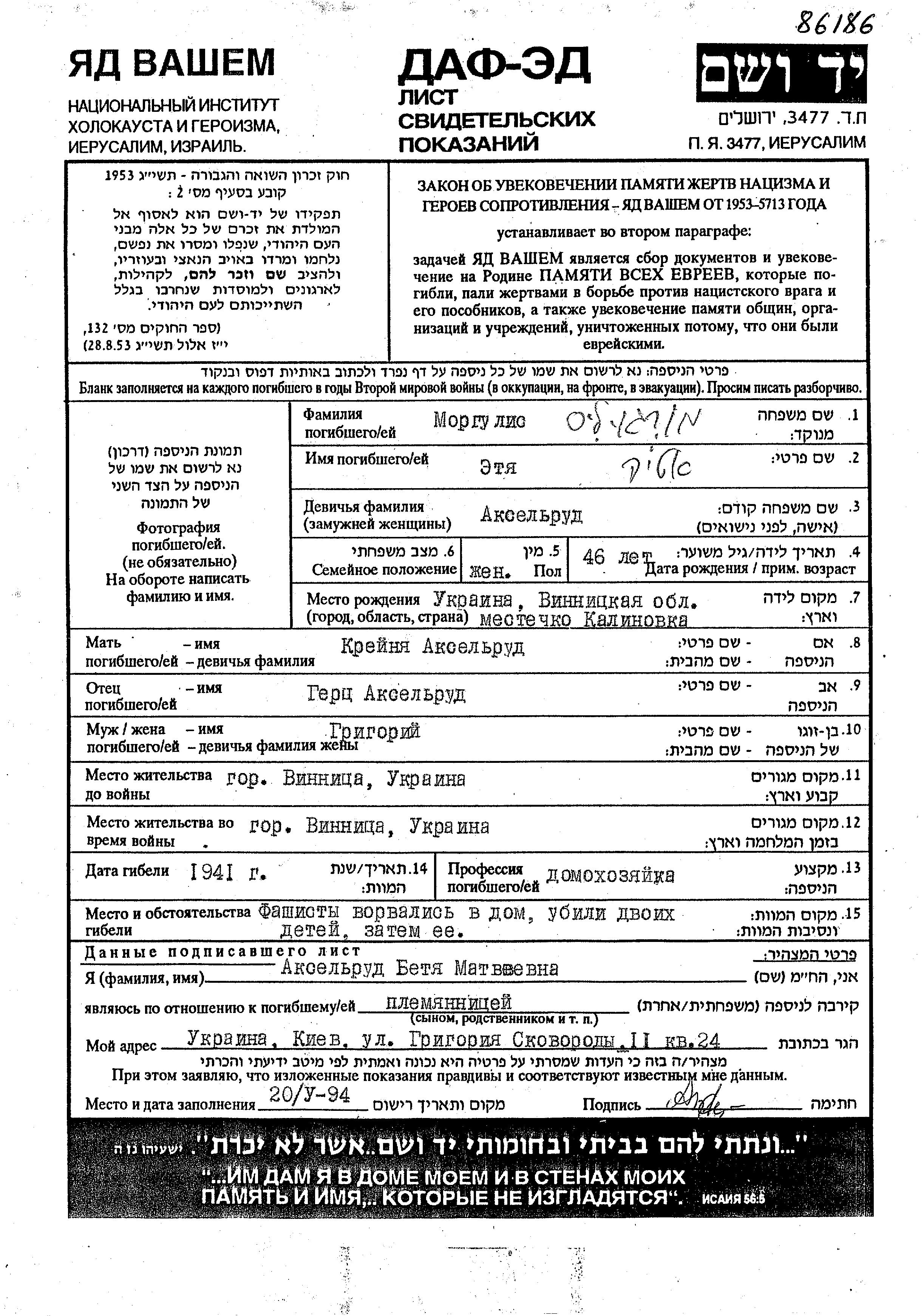 Morgulis Etia 1895 Vinnitsa, Ukraine (USSR) Page of Testimony