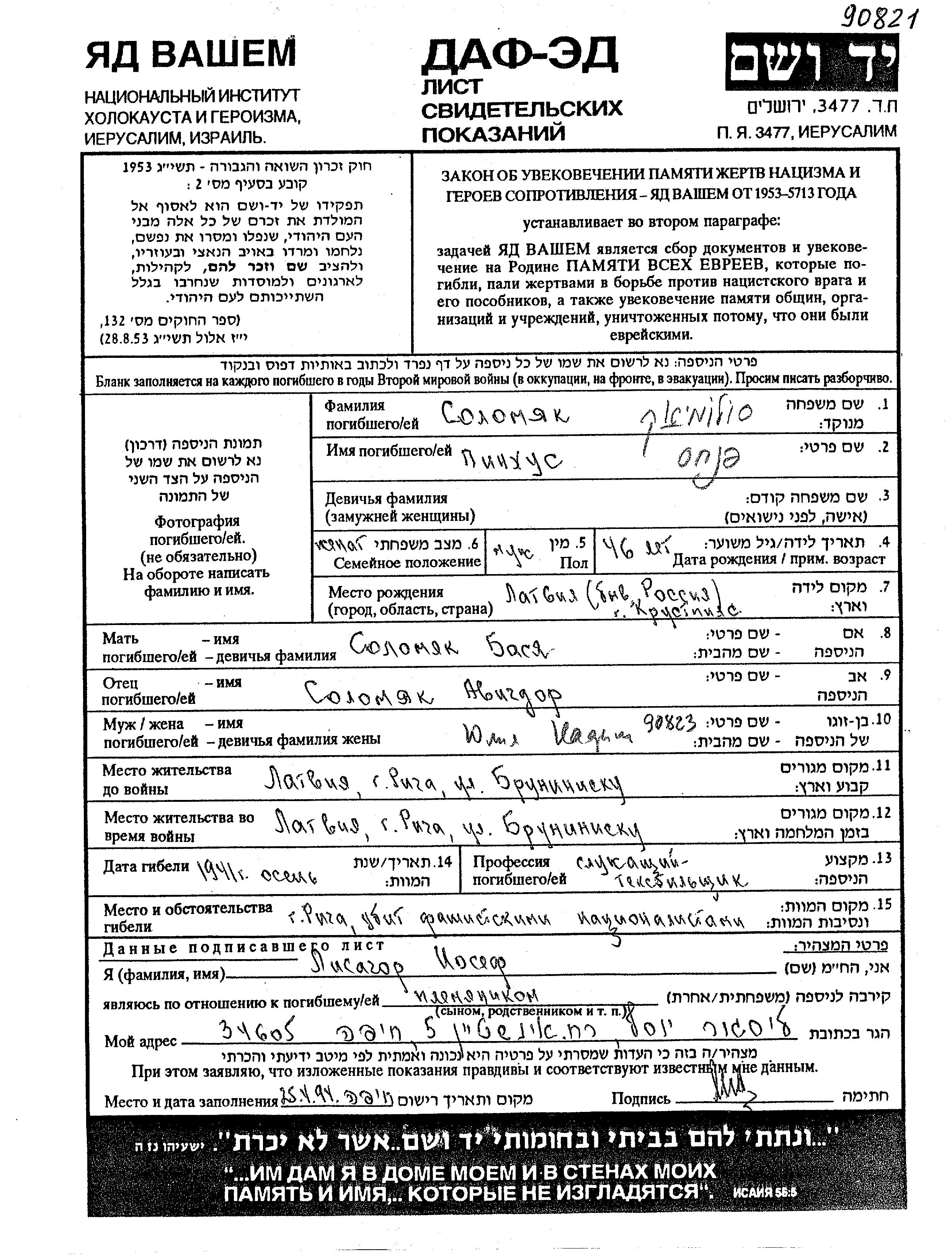 Pinkhus Solomyak was born in Krustpils, Latvia, 1895 to Avigdor and Basia. He was a clerk and married to Yulia. Prior to WWII he lived in Riga, Latvia. During the war he was in Riga, Latvia. Pinkhus was murdered in the Shoah. Place of death: Riga, Latvia, 1941.