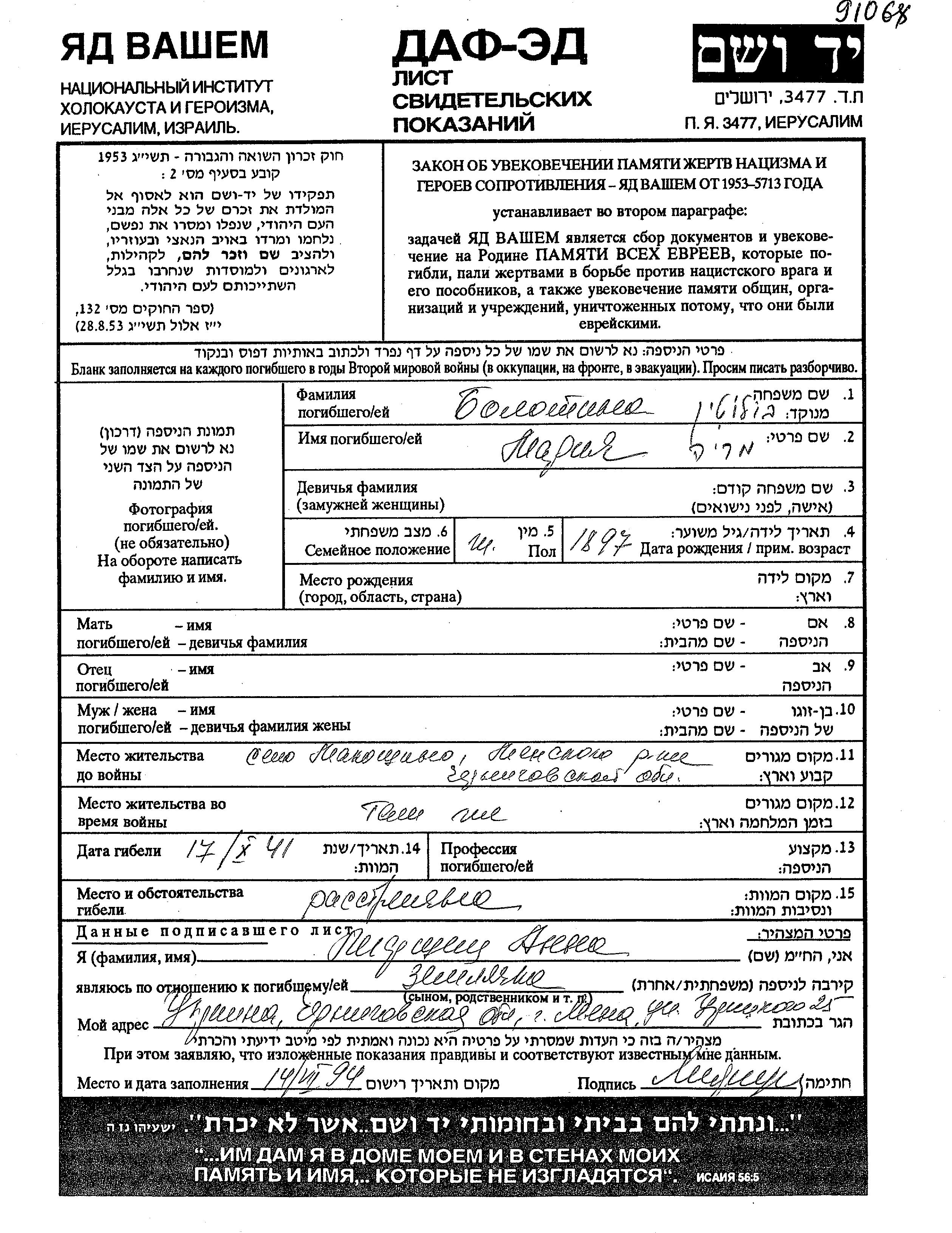 Maria Bolotin was born, 1897. Prior to WWII she lived in Makoshino, Ukraine (USSR). During the war she was in Makoshino, Ukraine (USSR). Maria was murdered in the Shoah. Place of death: unknown, 17/10/1941.