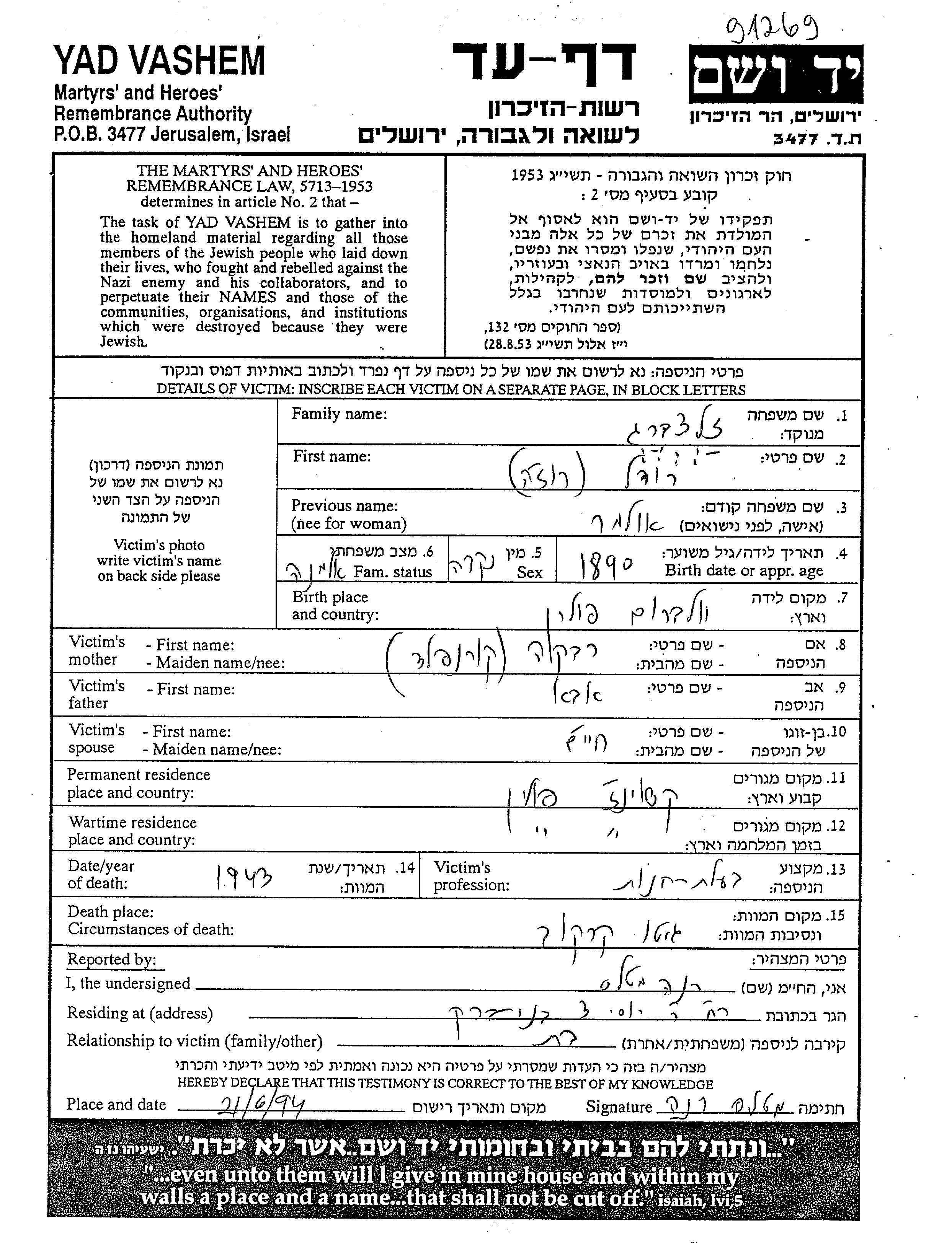 Rudel Roza Zaltzberg nee Ulmer was born in Wolbrom, Poland, 1890 to Aba and Rivka nee Kornfeld. She was a shop owner and married to Chaim. Prior to WWII she lived in Ksiaz Wielki, Poland. During the war she was in Ksiaz Wielki, Poland. Rudel Roza was murdered in the Shoah. Place of death: Krakow, Poland, 1943.