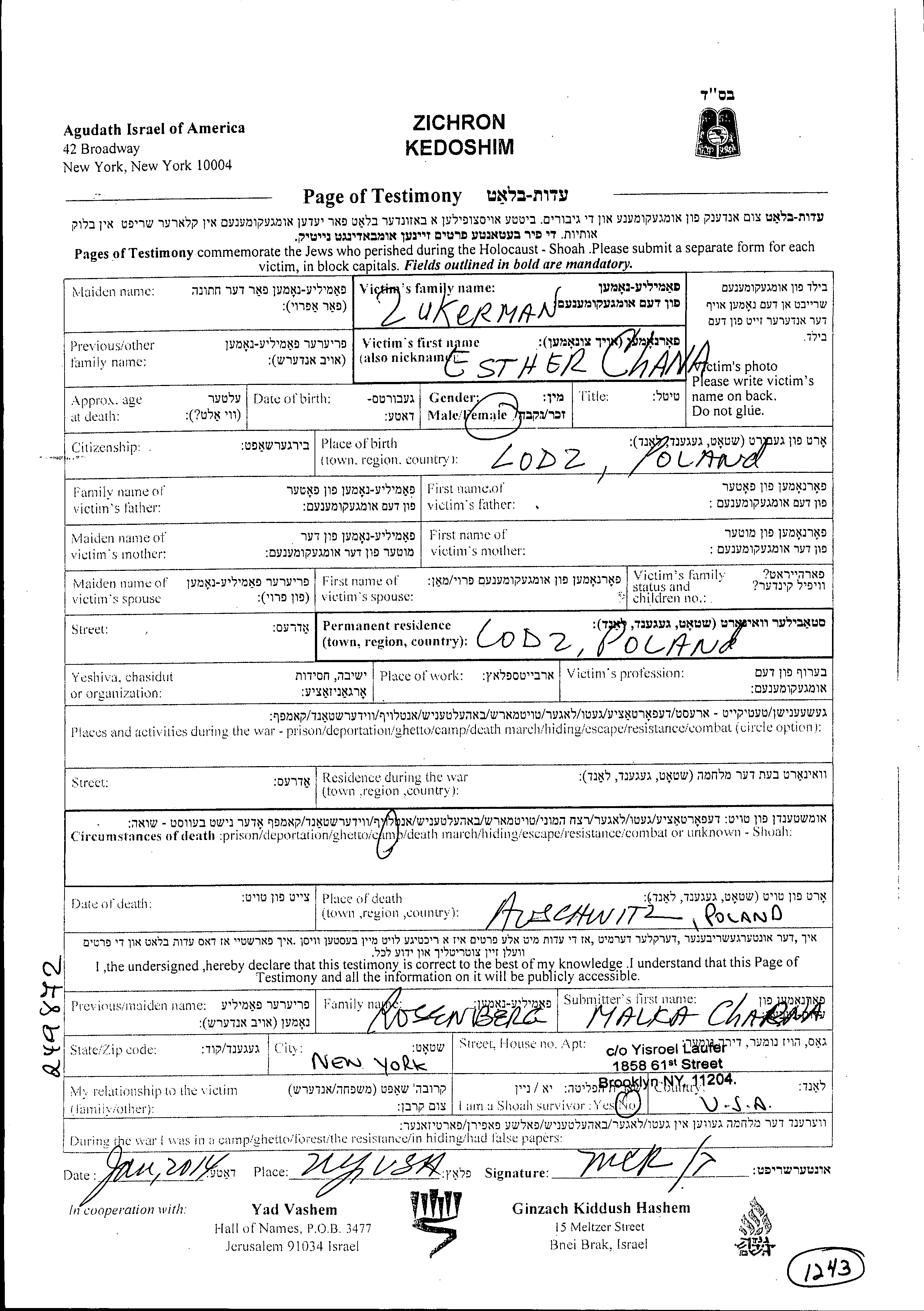 Zukerman Esther Chana Lodz, Poland Page of Testimony