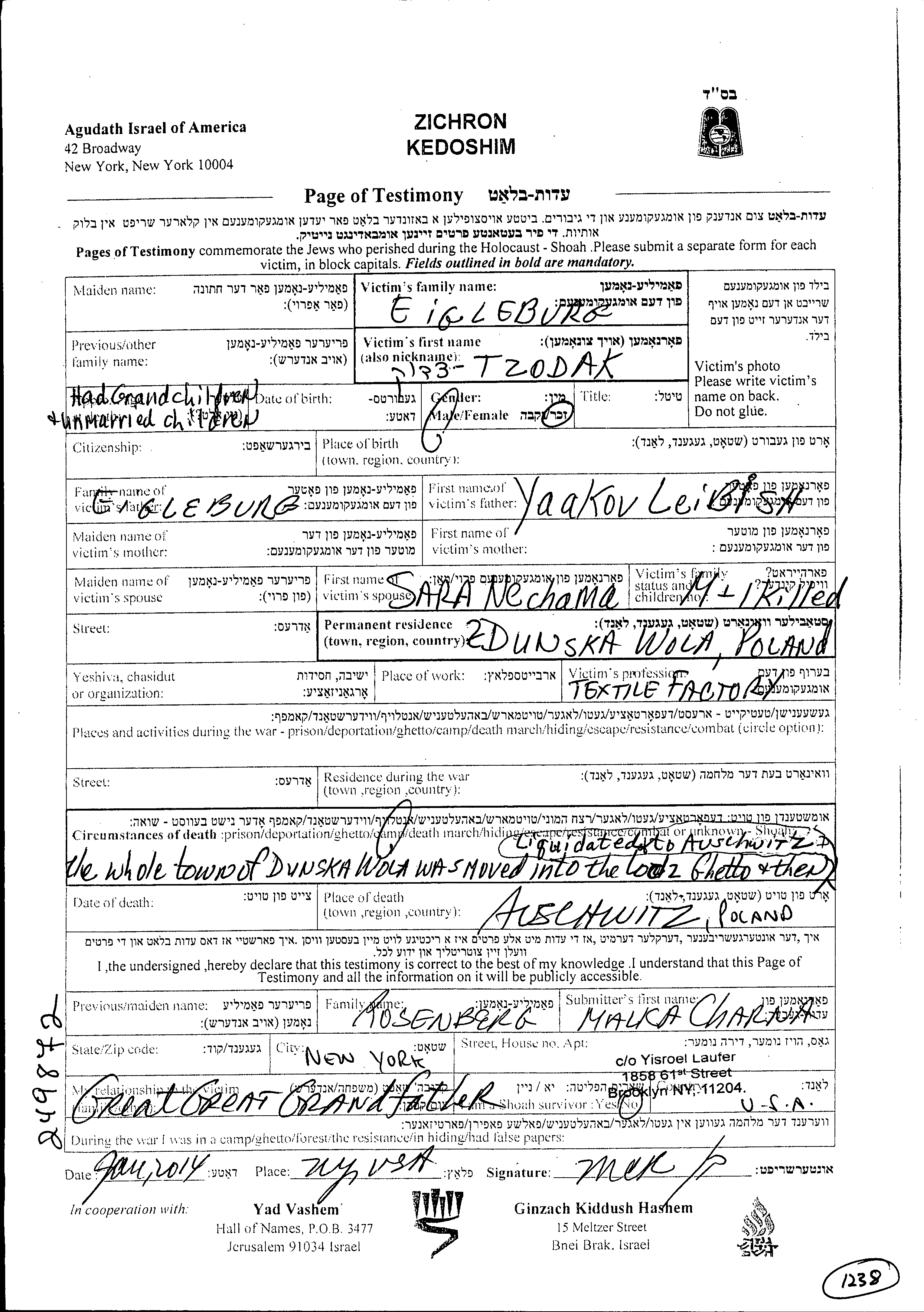 Tzodak Eigleburg was born to Yaakov Leibish. He was a textile factory owner and married to Sara Nechama. Prior to WWII he lived in Zdunska Wola, Poland. During the war he was in Lodz, Poland. Tzodak was murdered in the Shoah. Place of death: Auschwitz, Poland.